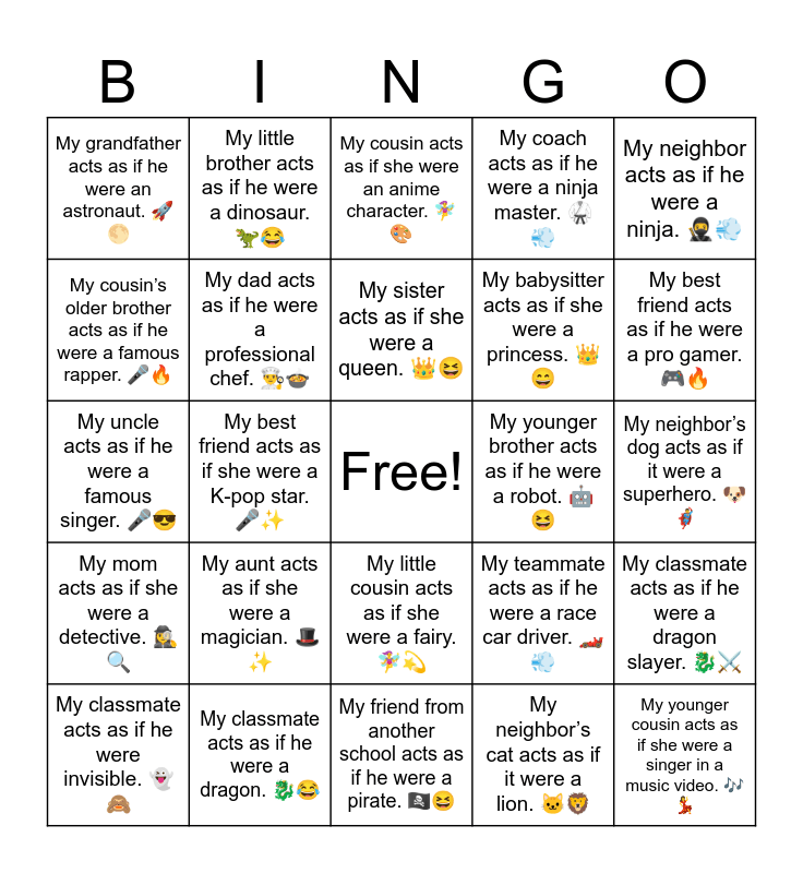 This bingo card has a free space and 33 words: My little sister acts as if she were a princess. ๐๐, My older brother acts as if he were a superhero. ๐ฆธโโ๏ธ๐ฅ, My best friend acts as if she were a K-pop star. ๐คโจ, My cousin acts as if he were a famous YouTuber. ๐ฅ๐, My mom acts as if she were a detective. ๐ต๏ธโโ๏ธ๐, My dad acts as if he were a professional chef. ๐จโ๐ณ๐ฒ, My neighbor acts as if he were a ninja. ๐ฅท๐จ, My classmate acts as if he were invisible. ๐ป๐, My little brother acts as if he were a dinosaur. ๐ฆ๐, My teammate acts as if he were a football star. โฝ๐ฅ, My sister acts as if she were a queen. ๐๐, My cousin acts as if she were an anime character. ๐งโโ๏ธ๐จ, My teacher acts as if she were a pop idol. ๐ถ๐ฉโ๐ซ, My older sister acts as if she were a fashion model. ๐โจ, My younger brother acts as if he were a robot. ๐ค๐, My best friend acts as if he were a pro gamer. ๐ฎ๐ฅ, My classmate acts as if he were a dragon. ๐๐, My uncle acts as if he were a famous singer. ๐ค๐, My aunt acts as if she were a magician. ๐ฉโจ, My teammate acts as if he were a race car driver. ๐๏ธ๐จ, My little cousin acts as if she were a fairy. ๐งโโ๏ธ๐ซ, My grandmother acts as if she were a detective in a movie. ๐ต๏ธโโ๏ธ๐ฌ, My grandfather acts as if he were an astronaut. ๐๐, My neighborโs dog acts as if it were a superhero. ๐ถ๐ฆธโโ๏ธ, My friend from another school acts as if he were a pirate. ๐ดโโ ๏ธ๐, My younger cousin acts as if she were a singer in a music video. ๐ถ๐, My coach acts as if he were a ninja master. ๐ฅ๐จ, My babysitter acts as if she were a princess. ๐๐, My cousinโs older brother acts as if he were a famous rapper. ๐ค๐ฅ, My classmate acts as if he were a dragon slayer. ๐โ๏ธ, My little sister acts as if she were the president. ๐๏ธ๐, My neighborโs cat acts as if it were a lion. ๐ฑ๐ฆ and My teammate acts as if he were a superhero saving the world. ๐ฆธโโ๏ธ๐.