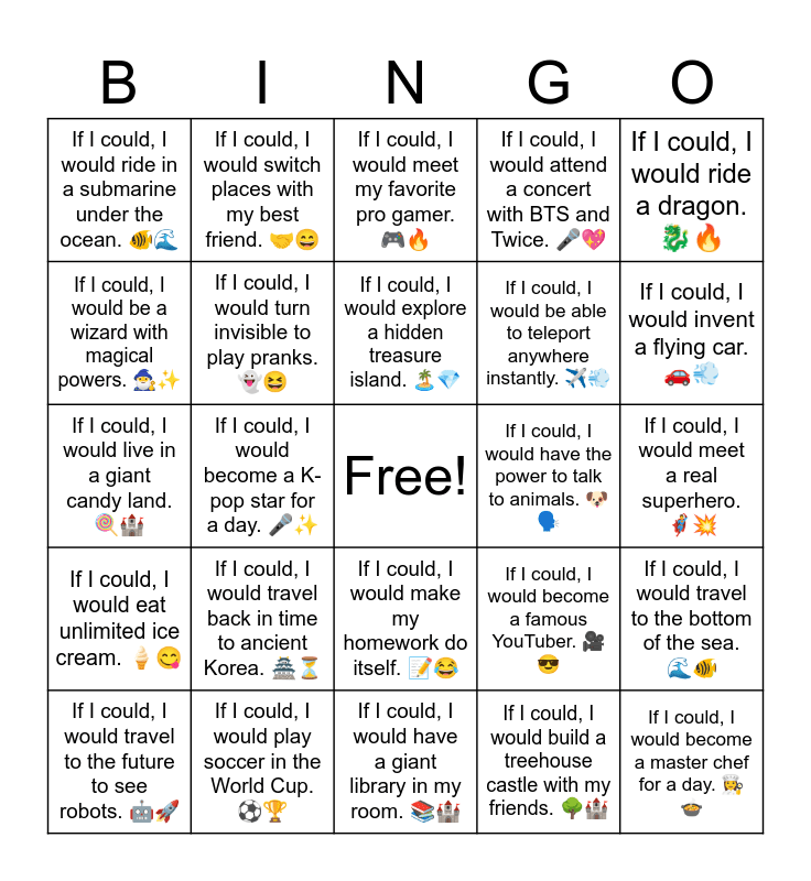 This bingo card has a free space and 33 words: If I could, I would travel back in time to meet dinosaurs. 🦖⏳, If I could, I would fly to the moon. 🌕🚀, If I could, I would become a K-pop star for a day. 🎤✨, If I could, I would visit the Hogwarts castle. 🏰🪄, If I could, I would eat unlimited ice cream. 🍦😋, If I could, I would turn invisible to play pranks. 👻😆, If I could, I would ride a dragon. 🐉🔥, If I could, I would travel to the future to see robots. 🤖🚀, If I could, I would switch places with my best friend. 🤝😄, If I could, I would swim with dolphins. 🐬🌊, If I could, I would explore a hidden treasure island. 🏝️💎, If I could, I would meet my favorite pro gamer. 🎮🔥, If I could, I would have a pet unicorn. 🦄✨, If I could, I would visit every country in the world. 🌍✈️, If I could, I would have the power to talk to animals. 🐶🗣️, If I could, I would invent a flying car. 🚗💨, If I could, I would play soccer in the World Cup. ⚽🏆, If I could, I would live in a giant candy land. 🍭🏰, If I could, I would travel back in time to ancient Korea. 🏯⏳, If I could, I would become a famous YouTuber. 🎥😎, If I could, I would make my homework do itself. 📝😂, If I could, I would explore outer space in a spaceship. 🚀🌌, If I could, I would ride in a submarine under the ocean. 🐠🌊, If I could, I would meet a real superhero. 🦸♂️💥, If I could, I would have a giant library in my room. 📚🏰, If I could, I would become a master chef for a day. 👩🍳🍲, If I could, I would attend a concert with BTS and Twice. 🎤💖, If I could, I would be able to teleport anywhere instantly. ✈️💨, If I could, I would be a wizard with magical powers. 🧙♂️✨, If I could, I would travel to the bottom of the sea. 🌊🐠, If I could, I would spend a day as my favorite anime character. 🧚♀️🎨, If I could, I would build a treehouse castle with my friends. 🌳🏰 and If I could, I would play every video game in the world. 🎮😆.