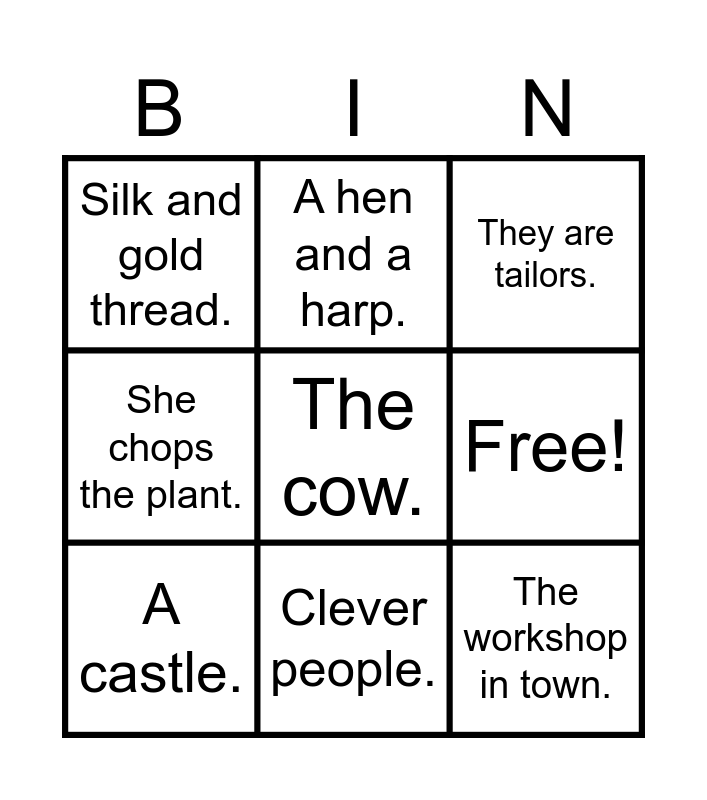 This bingo card has a free space and 10 words: Clever people., They are tailors., Silk and gold thread., The workshop in town., She chops the plant., A castle., A hen and a harp., The king's palace., Free! and Clever people..