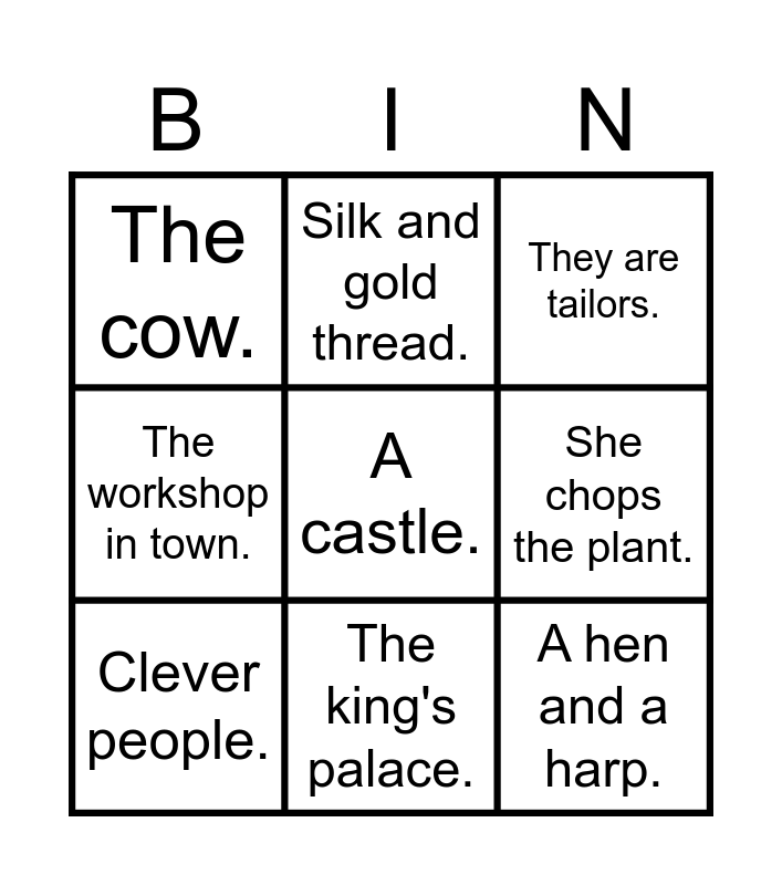 This bingo card has 9 words: Clever people., They are tailors., Silk and gold thread., The workshop in town., The cow., She chops the plant., A castle., A hen and a harp. and The king's palace..