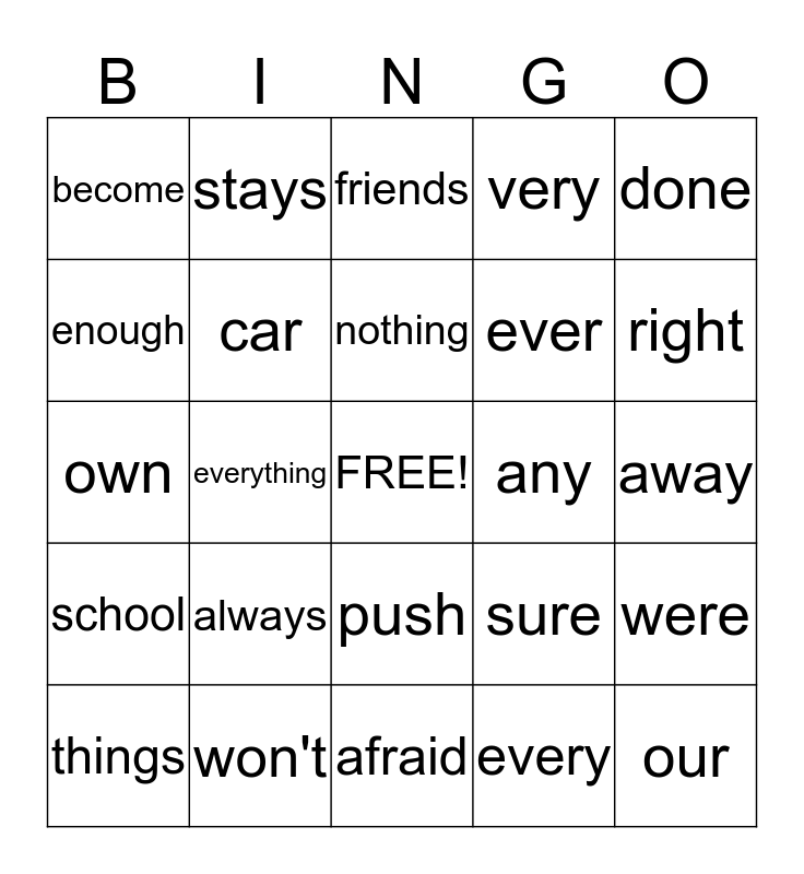 This bingo card has a free space and 24 words: always, won't, nothing, things, done, become, enough, stays, any, push, ever, own, sure, were, car, every, away, friends, right, everything, our, school, very and afraid.