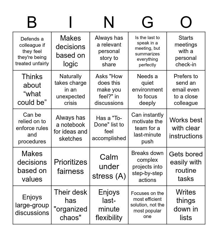 This bingo card has 109 words: Free!, Has a detailed, color-coded calendar, Can instantly motivate the team for a last-minute push, Always plays devil's advocate in meetings, Known for remembering personal details about colleagues, Has a minimalist and organized desk, Gets energy from brainstorming sessions, Prefers to process ideas alone before sharing, The go-to person for fixing a complex technical problem, Always considers how a decision will impact the team's morale, Is always prepared with a Plan B (and C), Lights up when discussing future possibilities, Is a master of schedules and deadlines, Makes decisions based on logic over feelings, Often uses phrases like "What if…" or "I have a vision", Is the first to notice a colleague is having a bad day, Can be relied on to enforce rules and procedures, Has a "wait-and-see" approach before making a decision, Is known for making quick, decisive calls, Has a stash of snacks or emergency supplies in their desk, Gets bored easily with routine tasks, Is a whiz at finding practical shortcuts, Often connects ideas in unexpected, metaphorical ways, Is the team's "social coordinator", Prefers written communication over spontaneous meetings, Asks "How does this make you feel?" in discussions, Starts meetings with a personal check-in, Gets straight to the point without small talk, Often says "The data suggests, Uses lots of hand gestures and expressive language when talking, Prefers to send an email even to a close colleague, Is the last to speak in a meeting, but summarizes everything perfectly, Always has a relevant personal story to share, Plays "mediator" when there's team disagreement, Will openly admit when they don't know something, Has a "To-Done" list to feel accomplished, Thrives under a tight deadline, Gets distracted by new, shiny projects, Their desk has "organized chaos", Has a specific system for naming computer files, Volunteers to take meeting notes, Jumps between multiple tasks at once, Needs a quiet environment to focus deeply, Always has a notebook for ideas and sketches, Breaks down complex projects into step-by-step actions, Weighs all options so long it leads to analysis paralysis, Makes a pro/con list for even small decisions, Trusts their gut instinct over a detailed report, Proposes a creative, "outside-the-box" solution, Asks "What are the potential risks?" first, Immediately starts brainstorming without all the facts, Wants to test a small version before full commitment, Focuses on the most efficient solution, not the most popular one, Pushes for a decision to be made to keep things moving, Connects two unrelated ideas to solve a problem, Remembers and celebrates team members' work anniversaries, Is the first to welcome a new team member, Challenges the team to aim higher and think bigger, Ensures everyone has a chance to speak in a meeting, Naturally takes charge in an unexpected crisis, Defends a colleague if they feel they're being treated unfairly, Shares interesting articles or podcasts with the whole team, Focuses on the task at hand, not the "team vibe", Gives direct, unfiltered feedback, Motivates by creating a fun, collaborative atmosphere, Enjoys planning ahead, Likes brainstorming new ideas, Prefers working independently, Energized by group activities, Notices small details quickly, Focuses on future possibilities, Makes decisions based on logic, Makes decisions based on values, Reflects before responding, Acts quickly when solving problems, Enjoys spontaneous work styles, Works best with clear instructions, Enjoys experimenting with new methods, Values harmony in the team, Gives direct feedback, Enjoys organizing tasks, Likes flexible schedules, Enjoys leading discussions, Keeps workspace neat, Writes things down in lists, Uses real examples to explain ideas, Enjoys abstract conversations, Focuses on facts and details, Thinks about “what could be”, Prefers practical solutions, Likes imagining future possibilities, Prioritizes fairness, Prioritizes harmony, Gives objective feedback, Considers people’s feelings in decisions, Finishes tasks early, Works well under pressure, Likes structured plans, Enjoys last-minute flexibility, Speaks to think, Thinks before speaking, Enjoys deep 1-on-1 conversations, Enjoys large-group discussions, Calm under stress (A), Driven under pressure (T), Spots errors easily, Enjoys problem-solving, Comfortable with change and Prefers routine and stability.