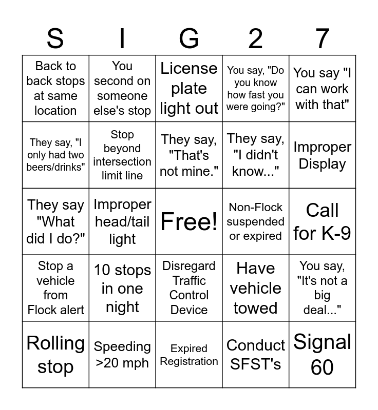 This bingo card has a free space and 29 words: Rolling stop, Traffic stop in garage, Improper head/tail light, No plates, Back to back stops at same location, License plate light out, Stop beyond intersection limit line, 10 stops in one night, Non-Flock suspended or expired, Speeding >20 mph, Call for K-9, Signal 60, Expired Registration, Conduct SFST's, Improper Display, Make some animal noise, Disregard Traffic Control Device, Stop a vehicle from Flock alert, You say "I can work with that", They say "What did I do?", Have vehicle towed, You say, "Do you remember me?" / "You look familiar", They say, "I didn't know...", They say, "I only had two beers/drinks", You say, "Do you know how fast you were going?", You second on someone else's stop, You say, "It's not a big deal...", They say, "That's not mine." and Stop with juveniles.