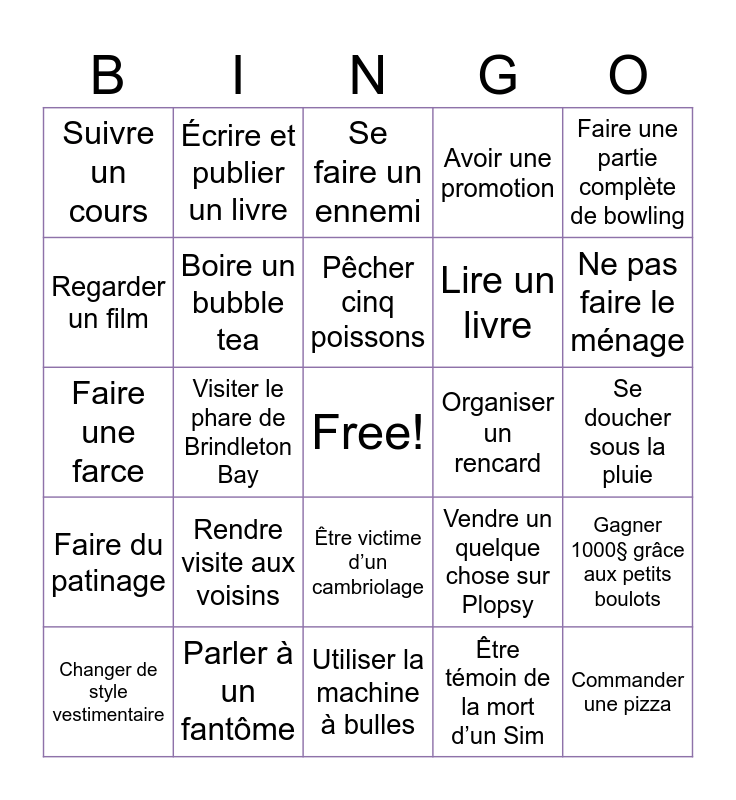 This bingo card has a free space and 84 words: Provoquer un incendie, Casser un objet, Se faire un ennemi, Se faire pipi dessus, Ne pas dormir de la nuit, Sécher les cours, Manquer le travail, Ne pas payer les factures, Manger au restaurant, Danser en boîte de nuit, Peindre une toile, Prendre un selfie avec un Sim déguisé, Boire un bubble tea, Organiser un rencard, Recevoir un massage, Suivre un cours, Changer de style vestimentaire, Regarder un film, Faire un don, Offrir un cadeau, Se faire un nouvel ami, Lire un livre, Commander une pizza, Terminer un puzzle, Visiter le phare de Brindleton Bay, Apprendre une nouvelle compétence artistique, Apprendre une nouvelle compétence mentale, Apprendre une nouvelle compétence physique, Admirer 3 œuvres au musée, Faire une séance de spiritisme, Rendre visite aux voisins, Inviter un ami à dormir, Faire un karaoké, Faire une farce, Se disputer avec un ami, Faire se reproduire des grenouilles, Utiliser la machine à bulles, Goûter un plat épicé, Ne pas faire le ménage, Faire du patinage, Adopter un rongeur, Faire une balade à vélo, Faire une randonnée, Goûter du nectar, Goûter le nigiri de fugu, Bronzer, Écrire et publier un livre, Débloquer l’aspiration Sandwich au fromage fondu, Compléter une mission à Henford-on-Bagley, Adopter un animal, Réussir un plongeon, Vendre un quelque chose sur Plopsy, Avoir une promotion, Se mettre en couple, Avoir un potager avec 10 plantes différentes, Fabriquer un meuble, Parler à un fantôme, Pêcher cinq poissons, Faire du camping, Se doucher sous la pluie, Publier une vidéo, Faire une session complète de jeu vidéo, Faire un vœu au puits à souhaits, Faire passer un plan d’action du quartierTerminer une collection, Composer une musique, Se transformer en occulte, Faire pousser une plante vache, Organiser un événement social en or, Faire une partie complète de bowling, Acheter un trait avec les points d’aspiration, Gagner 1000§ grâce aux petits boulots, Améliorer complètement un objet, Atteindre le niveau 10 d’une compétence, Compléter une aspiration, Être victime d’un cambriolage, Être témoin de la mort d’un Sim, Devenir ami avec la faucheuse, Découvrir le temple de Selvadorada, Visiter la grotte d’Oasis Springs, Gagner une étoile de célébrité, Tomber malade, Faire pousser un légume géant, Se lier d’amitié avec madame Ladentelle and Recevoir une bourse.