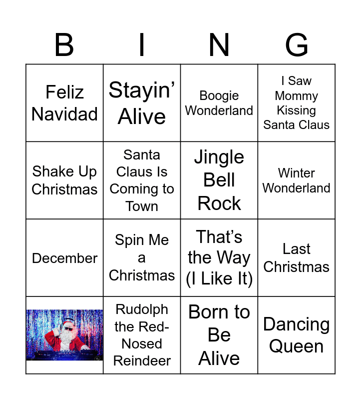 This bingo card has 4 images and 43 words: Free!, Moviestar, Stayin’ Alive, How Deep Is Your Love, Santa Claus Is Coming to Town, Hey America, Jingle Bell Rock, I Saw Mommy Kissing Santa Claus, Silver Bells, Winter Wonderland, Underneath the Tree, Jul Det’ Cool, Winter Wonderland, Rudolph the Red-Nosed Reindeer, Thank God It's Christmas, Shake Up Christmas, Last Christmas, Mary's Boy Child / Oh My Lord, Feliz Navidad, December, Santa Tell Me, Spin Me a Christmas, Let Love Be Love, It’s the Most Wonderful Time of the Year, The Hustle, Dancing Queen, I Will Survive, Funkytown, You're the First, the Last, My Everything, Can You Feel It, Daddy Cool, YMCA, Born to Be Alive, I’m Every Woman, Private Dancer, Celebration, We Are Family, Boogie Wonderland, That’s the Way (I Like It), It’s Raining Men, Rasputin, Blame It on the Boogie and Saturday Night.