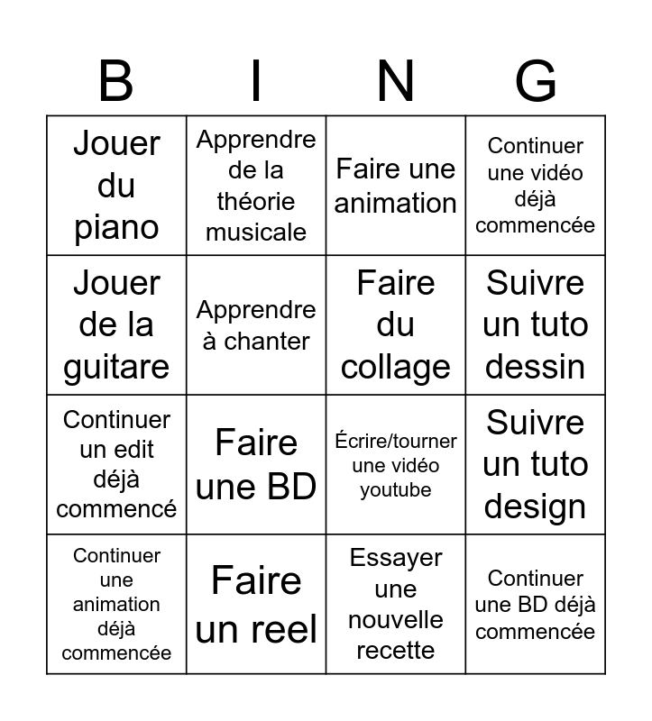 This bingo card has 25 words: Dessiner en tradi, Continuer un dessin déjà commencé, Suivre un tuto dessin, Avancer mon carnet de cuisine, Jouer de la guitare, Jouer du piano, Apprendre à chanter, Apprendre de la théorie musicale, Faire un reel, Faire du montage, Continuer un edit déjà commencé, Écrire/tourner une vidéo youtube, Streamer et uploader la VOD, Regarder un tuto de montage, Faire du collage, Lire 30 minutes, Essayer une nouvelle recette, Faire une animation, Faire une BD, Suivre un tuto design, Continuer une animation déjà commencée, Dessiner en digi, Continuer une BD déjà commencée, Continuer une vidéo déjà commencée and Apprendre Blender.