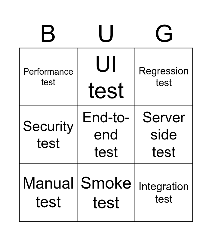 This bingo card has 12 words: Unit test, Integration test, End-to-end test, Server side test, UI test, Regression test, Smoke test, Compatibility test, Performance test, Security test, Manual test and Automated test.