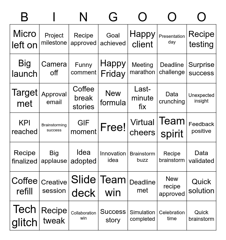 This bingo card has a free space and 49 words: New recipe approved, Deadline challenge, Simulation completed, Brainstorming success, Coffee break stories, Feedback positive, Project milestone, Collaboration win, Presentation day, Innovation idea, Recipe testing, Goal achieved, Data crunching, Last-minute fix, Creative session, Team spirit, Big launch, Surprise success, Quick solution, Happy client, Meeting marathon, GIF moment, Micro left on, Camera off, Tech glitch, Funny comment, Unexpected insight, Recipe tweak, New formula, Approval email, Shared laughter, Virtual cheers, Coffee refill, Slide deck, KPI reached, Brainstorm buzz, Recipe brainstorm, Data validated, Target met, Idea adopted, Team win, Recipe finalized, Quick brainstorm, Success story, Happy Friday, Recipe approved, Deadline met, Big applause and Celebration time.