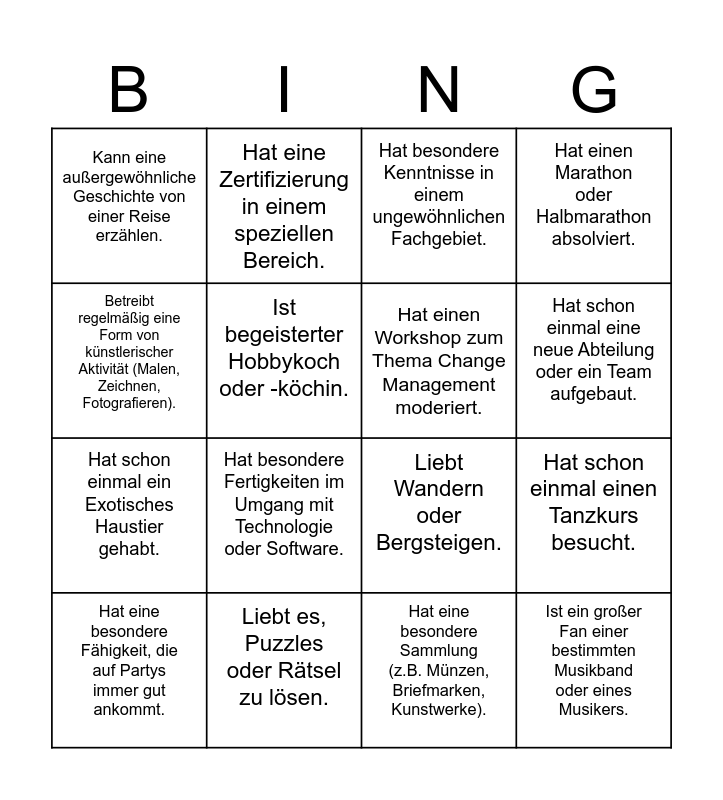 This bingo card has 35 words: Kennt mindestens drei Techniken zur aktiven Beteiligung der Teilnehmer., Hat Erfahrung mit virtuellen Workshop-Tools., Hat schon einmal einen Workshop in einer Fremdsprache gehalten., Hat einen Workshop zum Thema Change Management moderiert., Spricht mehr als zwei Sprachen fließend., Hat einen Marathon oder Halbmarathon absolviert., Ist begeisterter Hobbykoch oder -köchin., Spielt ein Musikinstrument., Hat schon einmal eine neue Abteilung oder ein Team aufgebaut., Hat ein Haustier., Liebt Wandern oder Bergsteigen., Betreibt regelmäßig eine Form von künstlerischer Aktivität (Malen, Zeichnen, Fotografieren)., Hat schon einmal einen Preis oder eine Auszeichnung gewonnen., Hat eine besondere Sammelleidenschaft., Kann eine außergewöhnliche Geschichte von einer Reise erzählen., Liebt es, Puzzles oder Rätsel zu lösen., Gärtnert gerne in seiner Freizeit., Hat schon einmal einen Tanzkurs besucht., Ist ein großer Fan einer bestimmten Musikband oder eines Musikers., Hat eine besondere Fähigkeit, die auf Partys immer gut ankommt., Hat schon einmal eine bedeutende berufliche Veränderung erlebt., Hat eine besondere Auszeichnung in der Schule oder Universität erhalten., Ist ein Fan von Dokumentarfilmen., Hat schon einmal ein Möbelstück selbst gebaut oder restauriert., Hat besondere Kenntnisse in einem ungewöhnlichen Fachgebiet., Hat besondere Fertigkeiten im Umgang mit Technologie oder Software., Hat schon einmal ein Buch oder eine wissenschaftliche Arbeit veröffentlicht., Ist ein begeisterter Fahrradfahrer und hat schon lange Radtouren unternommen., Hat schon einmal ein Exotisches Haustier gehabt., Hat eine besondere Sammlung (z.B. Münzen, Briefmarken, Kunstwerke)., Hat in mehr als 5 Städten gelebt., Kann ein Gedicht auswendig., Hat im letzten Jahr eine besondere Reise unternommen., Hat eine Zertifizierung in einem speziellen Bereich. and Hat schon mal an einem ungewöhnlichen Ort übernachtet..