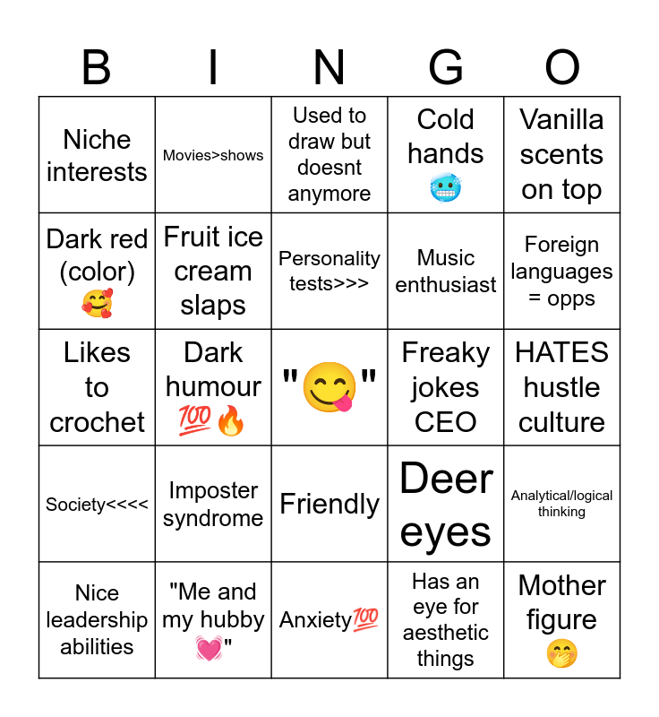 This bingo card has a free space and 24 words: Imposter syndrome, "Me and my hubby💓", Personality tests>>>, Nice leadership abilities, Vanilla scents on top, Niche interests, Dark red (color)🥰, Movies>shows, Freaky jokes CEO, Friendly, Music enthusiast, Likes to crochet, Deer eyes, Analytical/logical thinking, Fruit ice cream slaps, Has an eye for aesthetic things, HATES hustle culture, Used to draw but doesnt anymore, Foreign languages = opps, Dark humour 💯🔥, Mother figureðŸ¤, Society<<<<, Cold hands🥶 and Anxiety💯.