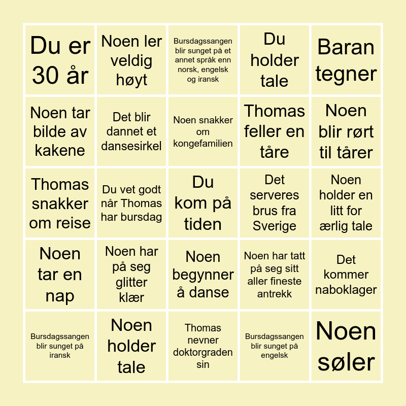 This bingo card has 43 words: Free!, Du kom på tiden, Du kom for sent, Bursdagssangen blir sunget på iransk, Bursdagssangen blir sunget sakte på norsk, Bursdagssangen blir sunget på engelsk, Bursdagssangen blir sunget på et annet språk enn norsk, engelsk og iransk, Noen sover på sofaen, Baran tegner, Noen holder tale, Du holder tale, Det serveres brus fra Sverige, Noen begynner å danse, Noen har på seg glitter klær, Thomas snakker om klatring, Thomas nevner doktorgraden sin, Thomas snakker om jobb, Thomas snakker om reise, Thomas holder tale, Noen blir rørt til tårer, Noen ler veldig høyt, Du er over 30 år, Du er under 30 år, Du er 30 år, Noen blir ICET, Noen holder en litt for ærlig tale, Du utbringer en skål, Du har reist langt for å være her, Noen har tatt på seg sitt aller fineste antrekk, Noen tar en nap, Noen klager på støynivået, Det kommer naboklager, Noen vet ikke hvor gammel Thomas blir, Du vet godt når Thomas har bursdag, Du ser noen som ikke synger bursdagssangen, Det blir tatt mer enn 1 bilde i løpet av kvelden, Noen søler, Noen snakker om kongefamilien, Noen tar bilde av kakene, Thomas feller en tåre, Noen fikk ikke med seg kleskoden, Det blir dannet et dansesirkel and Det blir startet opp karaoke.