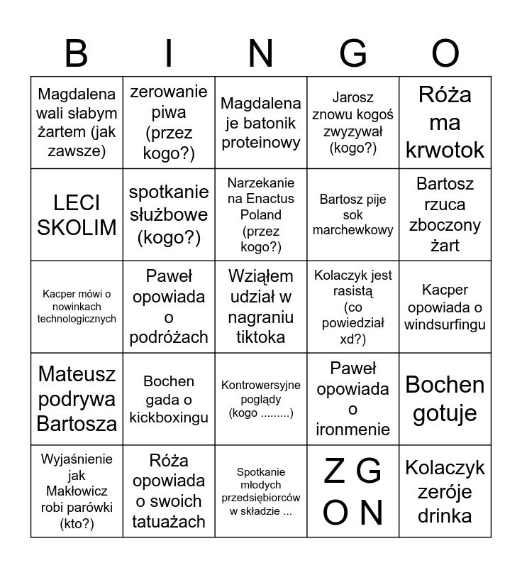 This bingo card has 25 words: Bochen gada o kickboxingu, Spotkanie młodych przedsiębiorców w składzie ..., Narzekanie na Enactus Poland (przez kogo?), Wyjaśnienie jak Makłowicz robi parówki (kto?), Róża ma krwotok, Magdalena wali słabym żartem (jak zawsze), LECI SKOLIM, zerowanie piwa (przez kogo?), Kolaczyk jest rasistą (co powiedział xd?), Kontrowersyjne poglądy (kogo .........), Bartosz pije sok marchewkowy, Kacper mówi o nowinkach technologicznych, Paweł opowiada o ironmenie, Bochen gotuje, spotkanie służbowe (kogo?), Kolaczyk zeróje drinka, Kacper opowiada o windsurfingu, Magdalena je batonik proteinowy, Bartosz rzuca zboczony żart, Paweł opowiada o podróżach, Wziąłem udział w nagraniu tiktoka, Róża opowiada o swoich tatuażach, Mateusz podrywa Bartosza, Jarosz znowu kogoś zwyzywał (kogo?) and Z G O N.