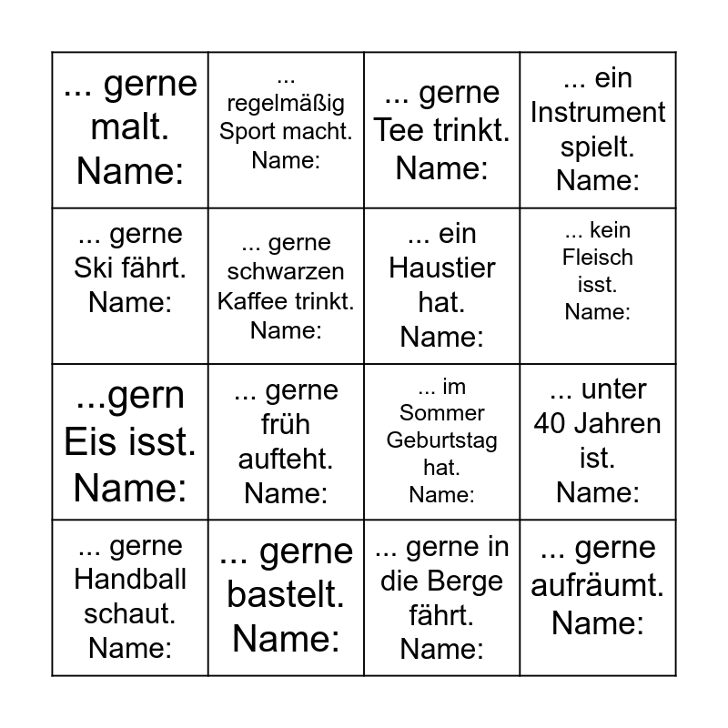 This bingo card has 24 words: … gerne Pizza isst. Name:, … gerne Mathe mag. Name:, ... kein Fleisch isst. Name:, ... eine Schwester hat. Name:, ... gerne Ski fährt. Name:, ... gerne malt. Name:, ... gerne schwarzen Kaffee trinkt. Name:, ... regelmäßig Sport macht. Name:, ... gerne bastelt. Name:, ... am längsten in der OGS arbeitet. Name:, ...gern Eis isst. Name:, ... im Sommer Geburtstag hat. Name:, ... eine weitere Sprache sprechen kann. Name:, ... in einem anderen Land geboren ist. Name:, ... ein Haustier hat. Name:, ... einen zweiten Vornamen hat. Name:, ... gerne in die Berge fährt. Name:, ... gerne Tee trinkt. Name:, ... gerne früh aufteht. Name:, ... unter 40 Jahren ist. Name:, ... gerne Handball schaut. Name:, ... gerne aufräumt. Name:, ... ein Instrument spielt. Name: and ... nicht in Hürth wohnt. Name:.