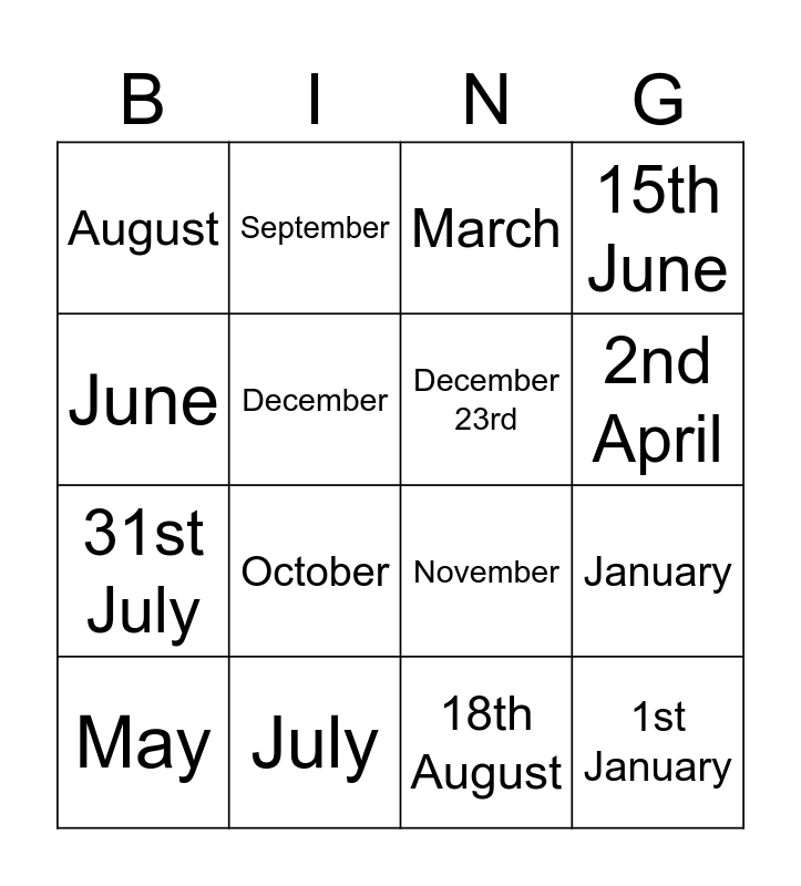 This bingo card has 20 words: January, February, March, April, May, June, July, August, 31st July, September, October, November, December, 1st January, December 23rd, September 9th, 2nd April, 15th June, 18th August and December 25th.