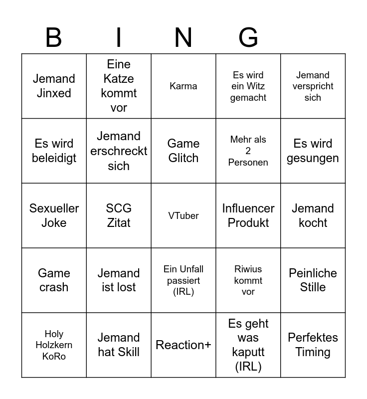 This bingo card has 25 words: Jemand ist lost, Reaction+, Game Glitch, Holy Holzkern KoRo, Jemand verspricht sich, Jemand Jinxed, Es wird beleidigt, Eine Katze kommt vor, Influencer Produkt, Ein Unfall passiert (IRL), Mehr als 2 Personen, Sexueller Joke, Riwius kommt vor, Peinliche Stille, Jemand erschreckt sich, Perfektes Timing, Jemand kocht, Karma, Es wird gesungen, SCG Zitat, VTuber, Jemand hat Skill, Game crash, Es wird ein Witz gemacht and Es geht was kaputt (IRL).