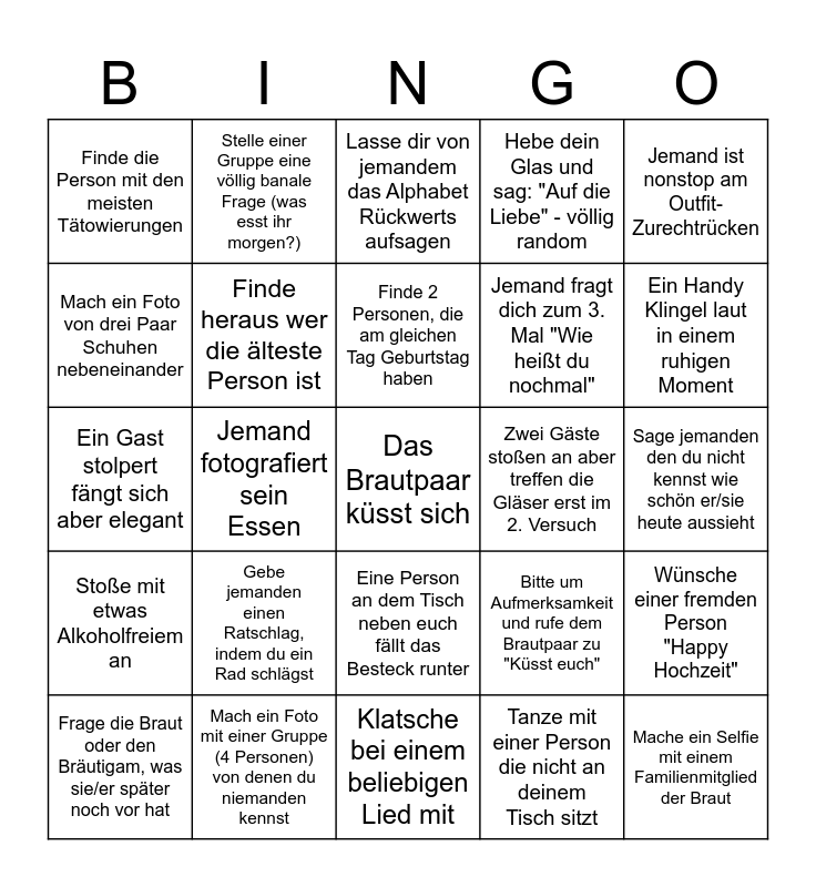 This bingo card has 25 words: Stoße mit etwas Alkoholfreiem an, Mach ein Foto mit einer Gruppe (4 Personen) von denen du niemanden kennst, Das Brautpaar küsst sich, Tanze mit einer Person die nicht an deinem Tisch sitzt, Jemand ist nonstop am Outfit-Zurechtrücken, Finde die Person mit den meisten Tätowierungen, Stelle einer Gruppe eine völlig banale Frage (was esst ihr morgen?), Lasse dir von jemandem das Alphabet Rückwerts aufsagen, Zwei Gäste stoßen an aber treffen die Gläser erst im 2. Versuch, Wünsche einer fremden Person "Happy Hochzeit", Mach ein Foto von drei Paar Schuhen nebeneinander, Finde heraus wer die älteste Person ist, Klatsche bei einem beliebigen Lied mit, Bitte um Aufmerksamkeit und rufe dem Brautpaar zu "Küsst euch", Ein Handy Klingel laut in einem ruhigen Moment, Frage die Braut oder den Bräutigam, was sie/er später noch vor hat, Jemand fotografiert sein Essen, Finde 2 Personen, die am gleichen Tag Geburtstag haben, Jemand fragt dich zum 3. Mal "Wie heißt du nochmal", Sage jemanden den du nicht kennst wie schön er/sie heute aussieht, Ein Gast stolpert fängt sich aber elegant, Gebe jemanden einen Ratschlag, indem du ein Rad schlägst, Eine Person an dem Tisch neben euch fällt das Besteck runter, Hebe dein Glas und sag: "Auf die Liebe" - völlig random and Mache ein Selfie mit einem Familienmitglied der Braut.