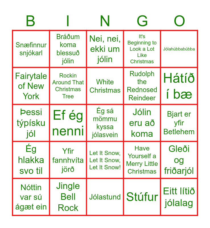 This bingo card has 35 words: All I Want for Christmas Is You, Mistletoe, Last Christmas, Rockin Around That Christmas Tree, Let It Snow, Let It Snow, Let It Snow!, It's Beginning to Look a Lot Like Christmas, Fairytale of New York, Christmas Lights, White Christmas, Santa Tell Me, Þessi týpísku jól, Jólahúbbabúbba, Jólahjól, Í skóginum stóð kofi einn, Snæfinnur snjókarl, Jólin eru að koma, Stúfur, Ef ég nenni, Ég hlakka svo til, Ég sá mömmu kyssa jólasvein, Have Yourself a Merry Little Christmas, Nóttin var sú ágæt ein, Gleði og friðarjól, Jingle Bell Rock, Nei, nei, ekki um jólin, Hátíð í bæ, Eitt lítið jólalag, I'll Be Home for Christmas, Rudolph the Rednosed Reindeer, Bjart er yfir Betlehem, Nú skal segja, Jólastund, Yfir fannhvíta jörð, Bráðum koma blessuð jólin and Prettyboi um jólin.