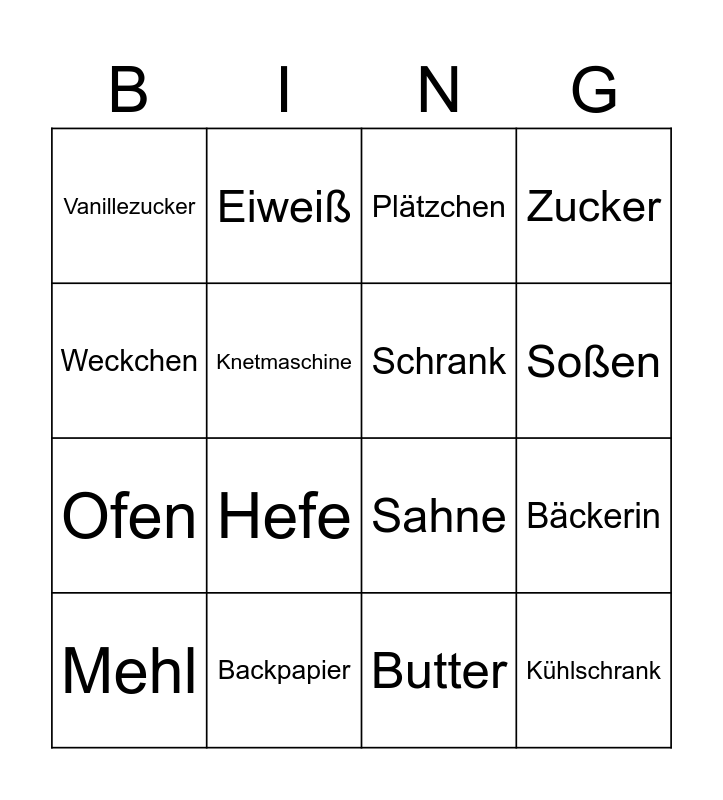 This bingo card has 32 words: Backstube, Backblech, Bäckerin, Eier, Kühlschrank, Schrank, Weckchen, Nudeln, Eiweiß, Eigelb, Soßen, Plätzchen, Verkaufsraum, Schokolade, Backpapier, Brezel, Apfel, Sahne, lebkuchen, Mehlwolke, Backform, banane, Butter, Milch, Mehl, Zucker, Ofen, Knetmaschine, Vanillezucker, Pizza, Brot and Hefe.
