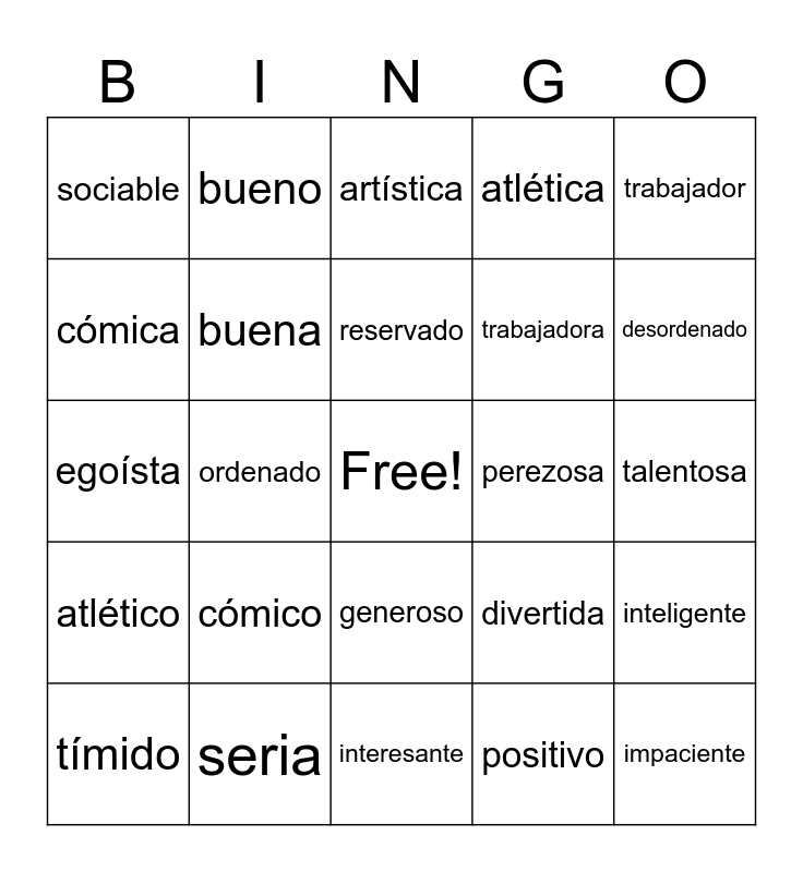 This bingo card has a free space and 24 words: cómico, seria, reservado, tímido, trabajador, sociable, cómica, bueno, perezosa, generoso, trabajadora, egoísta, divertida, inteligente, buena, positivo, talentosa, artística, desordenado, ordenado, impaciente, atlético, atlética and interesante.