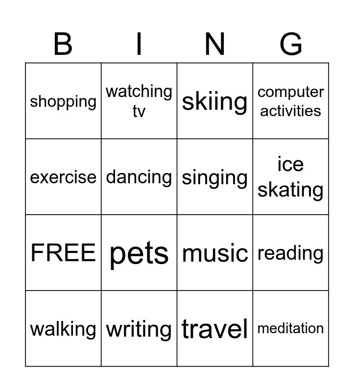 This bingo card has 28 words: playing cards, arts and crafts, music, playing an instrument, exercise, watching tv, skiing, reading, FREE, writing, word puzzles, computer activities, games, cooking, travel, driving, taking photos, pets, singing, meditation, shopping, swimming, bike riding, ice skating, walking, studying, dancing and listening to music.