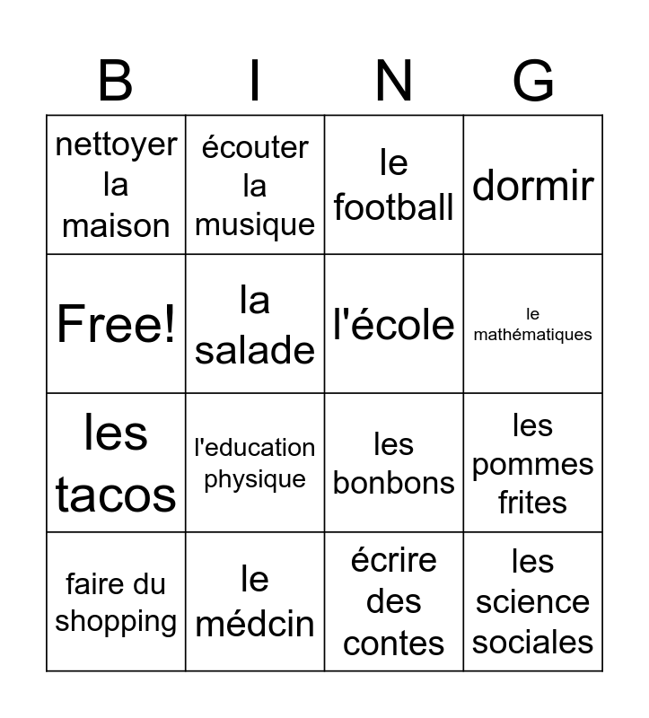 This bingo card has 16 words: le médcin, les pommes frites, le football, nettoyer la maison, les tacos, écouter la musique, les bonbons, écrire des contes, Free!, la salade, faire du shopping, dormir, l'education physique, le mathématiques, l'école and les science sociales.