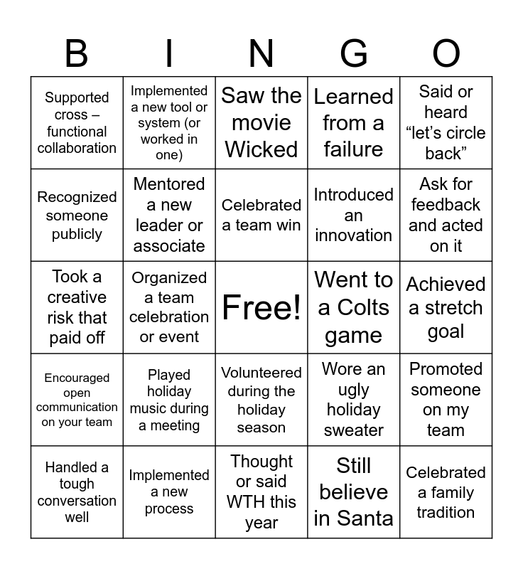 This bingo card has a free space and 24 words: Played holiday music during a meeting, Implemented a new process, Celebrated a team win, Handled a tough conversation well, Said or heard “let’s circle back”, Supported cross – functional collaboration, Recognized someone publicly, Implemented a new tool or system (or worked in one), Went to a Colts game, Volunteered during the holiday season, Introduced an innovation, Took a creative risk that paid off, Wore an ugly holiday sweater, Promoted someone on my team, Mentored a new leader or associate, Still believe in Santa, Achieved a stretch goal, Saw the movie Wicked, Ask for feedback and acted on it, Organized a team celebration or event, Celebrated a family tradition, Encouraged open communication on your team, Learned from a failure and Thought or said WTH this year.