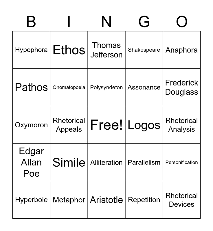 This bingo card has a free space and 24 words: Simile, Metaphor, Polysyndeton, Hyperbole, Anaphora, Hypophora, Pathos, Ethos, Logos, Alliteration, Assonance, Oxymoron, Parallelism, Personification, Onomatopoeia, Repetition, Rhetorical Analysis, Thomas Jefferson, Frederick Douglass, Rhetorical Appeals, Rhetorical Devices, Edgar Allan Poe, Shakespeare and Aristotle.