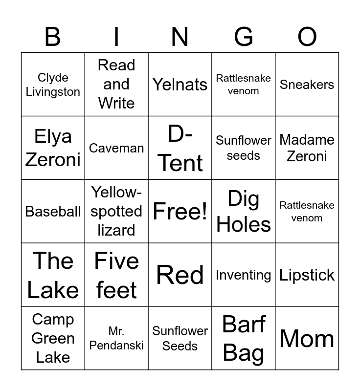 This bingo card has a free space and 29 words: Camp Green Lake, Peaches, Yellow-spotted lizard, Shoes, Clyde Livingston, Yelnats, Caveman, Five feet, Dig Holes, Mr. Pendanski, Rattlesnake venom, Mom, Sunflower Seeds, Barf Bag, Madame Zeroni, Gold tube, Red, The Lake, Sneakers, Baseball, Inventing, Fossil, Sunflower seeds, Elya Zeroni, Rattlesnake venom, Read and Write, Lipstick, D-Tent and Fish.