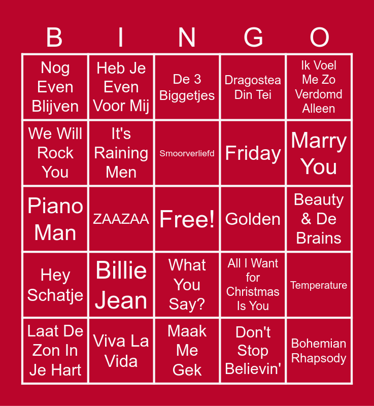This bingo card has a free space and 99 words: Terug In De Tijd, Ich bin wie du, Dromen Zijn Bedrog, Dragostea Din Tei, Captain Jack, Viben, Leef, Total Eclipse of the Heart, The Way You Make Me Feel, Rasputin, Gaan We Weg?, Blurred Lines, Schudden, Golden, Why Tell Me Why, Nog Even Blijven, Heb Je Even Voor Mij, Baila de Gasolina, Geef Mij Je Angst, Anton aus Tirol, Wackelkontakt, Sweet Caroline, Ein Prosit der Gemütlichkeit, Jan Klaassen De Trompetter, Geen Centen Maar Spullen, Laat De Zon In Je Hart, ZAAZAA, Kali, Toppertje!, Banger Hart, Forever, Witte Was, Mistletoe, What Do You Mean?, Ik Voel Me Zo Verdomd Alleen, Piano Man, If I Tell You, Only Girl, Fireball, Beauty & De Brains, Domino, Viva La Vida, De 3 Biggetjes, All I Want for Christmas Is You, Gimme! Gimme! Gimme!, Solo!, …Baby One More Time, Atje Voor De Sfeer, Sugardaddy, Wat Zou Je Doen?, Raise Your Glass, What Makes You Beautiful, Maak Me Gek, Bagagedrager, Country Roads, Wilhelmus, Jungle, One Night Stand, Geronimo, Bohemian Rhapsody, Purple Rain, Like a Prayer, Stayin' Alive, Stitches, Sweet Child O' Mine, We Will Rock You, Moves Like Jagger, Rosanne, Goud, Marry You, Hot N Cold, Billie Jean, Smoorverliefd, Zoet, Zout, Zuur, Suzanne, Boogie Wonderland, It's Raining Men, Per Spoor, Tijdmachine, My Little Lady, Hey Schatje, Het Regent Zonnestralen, You're The One That I Want, Don't Stop Believin', Levels - Radio Edit, I'm Still Standing, Be My Lover, Sexy Als Ik Dans, Friday, Temperature, Mwaki, I'm So Excited, What You Say?, Echte Liefde Is Te Koop, No Go Zone, Bumpy Ride, Last Friday Night, Engelbewaarder and Şımarık.