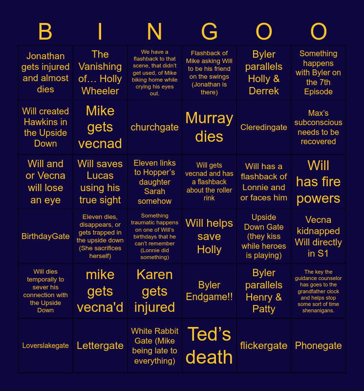 This bingo card has 36 words: Byler Endgame!!, Karen gets injured, Ted’s death, Will created Hawkins in the Upside Down, BirthdayGate, Will gets vecnad and has a flashback about the roller rink, Mike gets vecnad, White Rabbit Gate (Mike being late to everything), Byler parallels Holly & Derrek, Byler parallels Henry & Patty, Max’s subconscious needs to be recovered, Flashback of Mike asking Will to be his friend on the swings (Jonathan is there), The key the guidance counselor has goes to the grandfather clock and helps stop some sort of time shenanigans., Will saves Lucas using his true sight, Murray dies, Jonathan gets injured and almost dies, Will dies temporally to sever his connection with the Upside Down, Will has a flashback of Lonnie and or faces him, Will and or Vecna will lose an eye, We have a flashback to that scene, that didn’t get used, of Mike biking home while crying his eyes out., Eleven links to Hopper’s daughter Sarah somehow, Eleven dies, disappears, or gets trapped in the upside down (She sacrifices herself), Will helps save Holly, Something traumatic happens on one of Will’s birthdays that he can’t remember (Lonnie did something), Upside Down Gate (they kiss while heroes is playing), The Vanishing of… Holly Wheeler, Cleredingate, Lettergate, churchgate, Something happens with Byler on the 7th Episode, Phonegate, Loverslakegate, Vecna kidnapped Will directly in S1, Will has fire powers, mike gets vecna'd and flickergate.