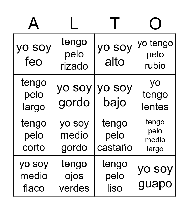 This bingo card has 20 words: tengo pelo medio largo, tengo ojos azules, yo soy alto, yo soy bonita, yo soy medio flaco, tengo pelo largo, tengo ojos verdes, yo soy feo, tengo pelo corto, tengo pelo rizado, yo soy medio gordo, tengo pelo castaño, yo soy gordo, yo soy guapo, yo soy bajo, yo tengo trenzas, yo tengo lentes, yo tengo pelo rubio, tengo pelo liso and yo tengo rastas.