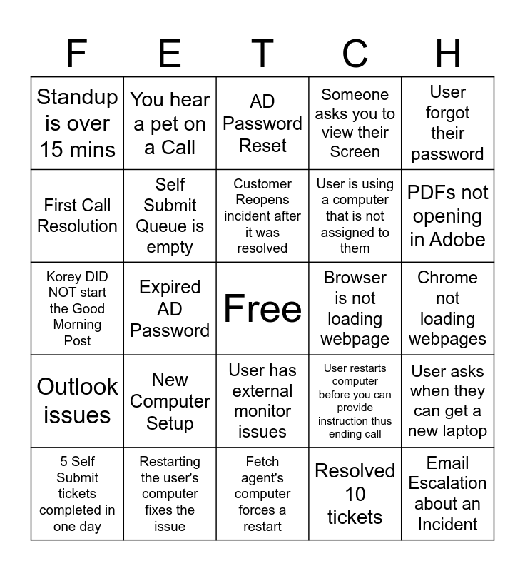 This bingo card has a free space and 74 words: Close out 3+ tickets after 3 strikes in a day, Add Printer to computer, AD Password Reset, AD Account Unlock, Need File Restore, Korey DID start the Good Morning Post, Update on Incident, Update on REQ/RITM, 5 Self Submit tickets completed in one day, Global Protect Issues, Konica Service Call, LAPS Needed, Customer Reopens incident after it was resolved, First Call Resolution, P1 Incident, Expired AD Password, Customer is not technical, PDFs not opening in Adobe, You get the same caller on the same day, Korey DID NOT start the Good Morning Post, Self Submit Queue is empty, You hear a pet on a Call, Someone asks you to view their Screen, Customer uses the word "glitching", Email Escalation about an Incident, Ask HR Transfer, TeamViewer doesn't work, Get a Leave of Absence caller, Wanting Permanent Local Admin Access, RbA Command Center Transfer, User forgot their password, Password Sync issue (computer using old password to sign in), Escalate a MFA reset for IT personnel, Verified User, Someone's pet joins a Teams Meeting, Resolved 10 tickets, Windows 11 User, Escalate an Incident, Office Wireless Certificate issue, MFA Reset, Fetch agent's computer forces a restart, Restarting the user's computer fixes the issue, Headset issue, Issue caused by not being connected to Global Protect/Andersen network, Agent took 15+ inbound calls in 1 day, Standup is over 15 mins, Standup is under 5 mins, New Computer Setup, Customer has to end the call because they have another appointment, LAPS did not give a password in Azure, Teams Add-in missing in Outlook, User is not sure if the email is suspicious, Chrome not loading webpages, Wrong Number, Outlook Profile Rebuild, Get a ticket/call for application IT doesn't support, User has external monitor issues, User has keyboard or mouse issues, Users account is disabled, User asks when they can get a new laptop, User is using a computer that is not assigned to them, Entering Credentials incorrectly, Outlook issues, Microsoft Teams issues, Browser is not loading webpage, Caller is driving and can't troubleshooy, Suspend BitLocker for update, User says they submitted a request but not showing up in ServiceNow, User restarts computer before you can provide instruction thus ending call, 10 Self Submit Tickets completed in one day, Map a network drive, Attend 2+ Meetings in a day, Free and Free.