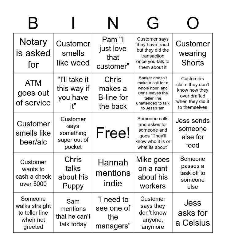 This bingo card has a free space and 105 words: These are nice Pens, Customer has Colored Hair, Customer wearing Shorts, Bald Customer, Byrne Dairy needs official check, Shelly rants about byrne dairy, Mary Joe from DG has her hood up, Customer brings up Michelle(Not Daryle), Customer says " I got my pick of people today", Jess talks to someone like their mother by yelling their name, Everyone knows me here, “Why Do I need ID”, Someone calls one of us by the wrong name, Ron texts Jess after he leaves, Chris talks about the roman empire, Jess talks about divorce, Pam "I just love that customer", Customer calls and whoever answers doesn't get their name, Customer goes on political rant, Someone says someone other than Jess is the manager, Someone needs a Money Order, Someone wants a debit card printed in branch, Chris brings up Chron’s, Jess cackles, Customer mentions the Weather, Chris talks about his Puppy, Customers claim they don't know how they over drafted when they did it to themselves, Customer says they have fraud but they did the transaction once you talk to them about it, Ron comes in and goes directly to Jess's Office, Mike Stays for over an Hour, Mike goes on a rant about his workers, Customer says they don’t know anyone, anymore, Ricky makes sarcastic comment, Daryle sits down to talk in an office, Someone says something racist, Harry Hits the Buzzer, Pam Flips her hair, Jess says her tummy hurts, Chris makes a B-line for the back, Sam mentions that he can’t talk today, Sam “Needs an adult”, Customer wants to cash a check over 5000, Chris goes on a rant about a random topic for no reason, ATM goes out of service, Customer needs a new Debit Card, Notary is asked for, Card Stuck in ATM, Jess asks for a Celsius, Adult takes a Lollipop, Safe Deposit Box, Customer wants to steal a pen, Pam talks about her dad, Customer Lurks to wait for a Banker, Jess Mentions Target, Somebody says they don’t “Trust that machine” and counts the money, Group Argument, Hunter calls Jess, Someone Cries, Pam threatens the underwriters, Hannah mentions indie, Jess sends someone else for food, Jess mentions her kids, Hannah gets heated at her neighbors, Customer hits on employee, Customer comments on Sam & Chris being similar, Customer wearing sunglasses, Customer tank top, Customer smells like weed, Customer smells like beer/alc, Customer says something super out of pocket, “I need to see one of the managers”, Chris says "Holy Words", Chris say "Unlucky", Pam gives a customer a dirty look, Pam pretends to be on the phone, Chris talks about Therapy, Someone wants money a different way after you've already dispensed it., Someone says "I've never been asked for social before”, Someone walks straight to teller line when not greeted, Sam says "our friends in Washington", Hannah says how do people not understand, Pacing Customer, Customer says it looks like there’s a lot of people in the parking lot, “I'll take it this way if you have it”, Fraud, Someone calls and askes for someone and goes “They’ll know who it is or what its about”, At least 4 people Congregate in an office, Chris goes out for food for someone else, Customer mentions Chris’s redbulls, Customer smells bad, Chris Talks about Esports, Pam mentions she hasn’t gone on lunch yet, Chris talks about his hours in a game, At least 4/5 people on their phones at once, Someone passes a task off to someone else, No Pens in the cups,, Jess says we aren’t doing this today and then proceeds to do what she said, Someone gets a Credit Card Application, Banker doesn’t make a call for a whole hour, and Chris leaves the teller line unattended to talk to Jess/Pam, Chris talks about hiking, Someone complains about the temperature of the branch, Pam is cold, Jess is hot or “literally sweating”, Kathy needs something and Customer brings up Snow.