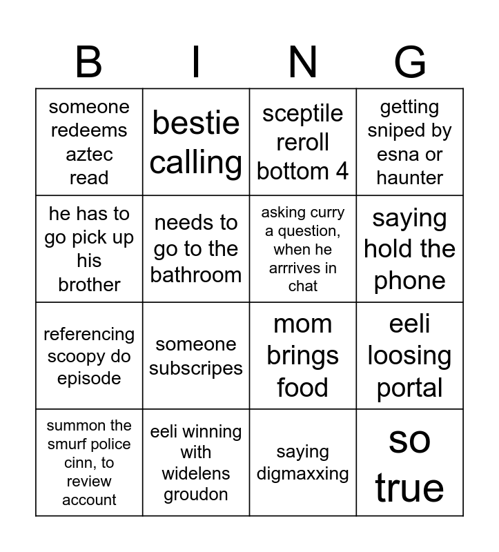 This bingo card has 16 words: eeli winning with widelens groudon, eeli loosing portal, sceptile reroll bottom 4, someone redeems aztec read, referencing scoopy do episode, bestie calling, mom brings food, saying digmaxxing, he has to go pick up his brother, needs to go to the bathroom, summon the smurf police cinn, to review account, getting sniped by esna or haunter, someone subscripes, saying hold the phone, asking curry a question, when he arrrives in chat and so true.