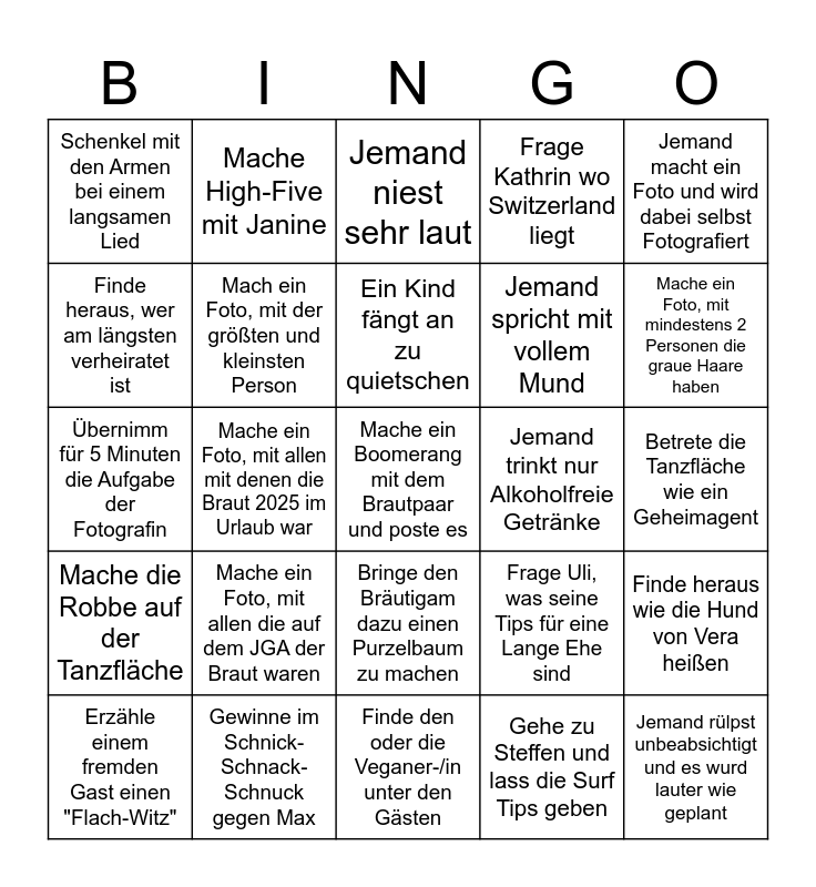 This bingo card has a free space and 24 words: Mache ein Foto, mit allen die auf dem JGA der Braut waren, Gewinne im Schnick- Schnack- Schnuck gegen Max, Ein Kind fängt an zu quietschen, Erzähle einem fremden Gast einen "Flach-Witz", Jemand macht ein Foto und wird dabei selbst Fotografiert, Schenkel mit den Armen bei einem langsamen Lied, Finde heraus, wer am längsten verheiratet ist, Mache High-Five mit Janine, Jemand trinkt nur Alkoholfreie Getränke, Bringe den Bräutigam dazu einen Purzelbaum zu machen, Jemand spricht mit vollem Mund, Übernimm für 5 Minuten die Aufgabe der Fotografin, Frage Uli, was seine Tips für eine Lange Ehe sind, Finde heraus wie die Hund von Vera heißen, Mach ein Foto, mit der größten und kleinsten Person, Gehe zu Steffen und lass die Surf Tips geben, Betrete die Tanzfläche wie ein Geheimagent, Jemand niest sehr laut, Mache ein Foto, mit mindestens 2 Personen die graue Haare haben, Mache ein Foto, mit allen mit denen die Braut 2025 im Urlaub war, Jemand rülpst unbeabsichtigt und es wurd lauter wie geplant, Mache die Robbe auf der Tanzfläche, Frage Kathrin wo Switzerland liegt and Finde den oder die Veganer-/in unter den Gästen.