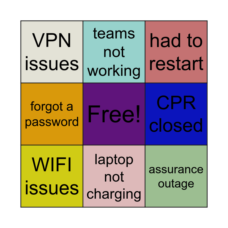 This bingo card has a free space and 8 words: CPR closed, had to restart, teams not working, WIFI issues, VPN issues, assurance outage, forgot a password and laptop not charging.