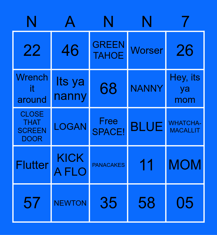 This bingo card has a free space and 24 words: KICK A FLO, NEWTON, 68, 57, 26, 22, Wrench it around, 46, BLUE, PANACAKES, NANNY, CLOSE THAT SCREEN DOOR, 11, MOM, Its ya nanny, 58, WHATCHA-MACALLIT, GREEN TAHOE, Hey, its ya mom, LOGAN, 05, Flutter, Worser and 35.