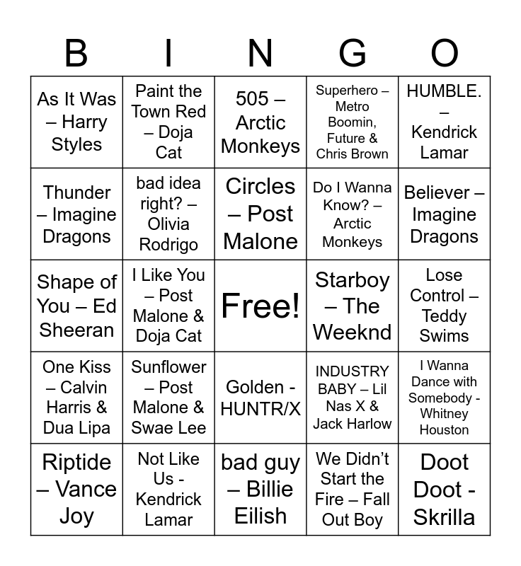 This bingo card has a free space and 51 words: Snooze – SZA, greedy – Tate McRae, First Person Shooter – Drake ft. J. Cole, We Didn’t Start the Fire – Fall Out Boy, Lose Control – Teddy Swims, Popular – The Weeknd, Playboi Carti & Madonna, Paint the Town Red – Doja Cat, FE!N – Travis Scott ft. Playboi Carti, Superhero – Metro Boomin, Future & Chris Brown, Lil Boo Thang – Paul Russell, As It Was – Harry Styles, bad idea right? – Olivia Rodrigo, bad guy – Billie Eilish, Starboy – The Weeknd, Blinding Lights – The Weeknd, Goosebumps – Travis Scott, I Like You – Post Malone & Doja Cat, Circles – Post Malone, Rockstar (Clean) – Post Malone ft. 21 Savage, Believer – Imagine Dragons, Thunder – Imagine Dragons, Heat Waves – Glass Animals, 505 – Arctic Monkeys, Do I Wanna Know? – Arctic Monkeys, Sweater Weather – The Neighbourhood, Riptide – Vance Joy, Sunflower – Post Malone & Swae Lee, STAY – The Kid LAROI & Justin Bieber, INDUSTRY BABY – Lil Nas X & Jack Harlow, HUMBLE. – Kendrick Lamar, Uptown Funk – Mark Ronson ft. Bruno Mars, 24k Magic – Bruno Mars, Treasure – Bruno Mars, Levitating – Dua Lipa, Break My Heart – Dua Lipa, One Kiss – Calvin Harris & Dua Lipa, Happier – Marshmello & Bastille, Closer – The Chainsmokers ft. Halsey, Something Just Like This – The Chainsmokers & Coldplay, Shivers – Ed Sheeran, Shape of You – Ed Sheeran, Deja Vu – Olivia Rodrigo, driver's license – Olivia Rodrigo, Smells Like Teen Spirit - Nirvana, Doot Doot - Skrilla, Sugar on my Tongue - Tyler the Creator, Not Like Us - Kendrick Lamar, Golden - HUNTR/X, Bad Blood - Taylor Swift, I Wanna Dance with Somebody - Whitney Houston and Beez in the Trap - Nicki Minaj.