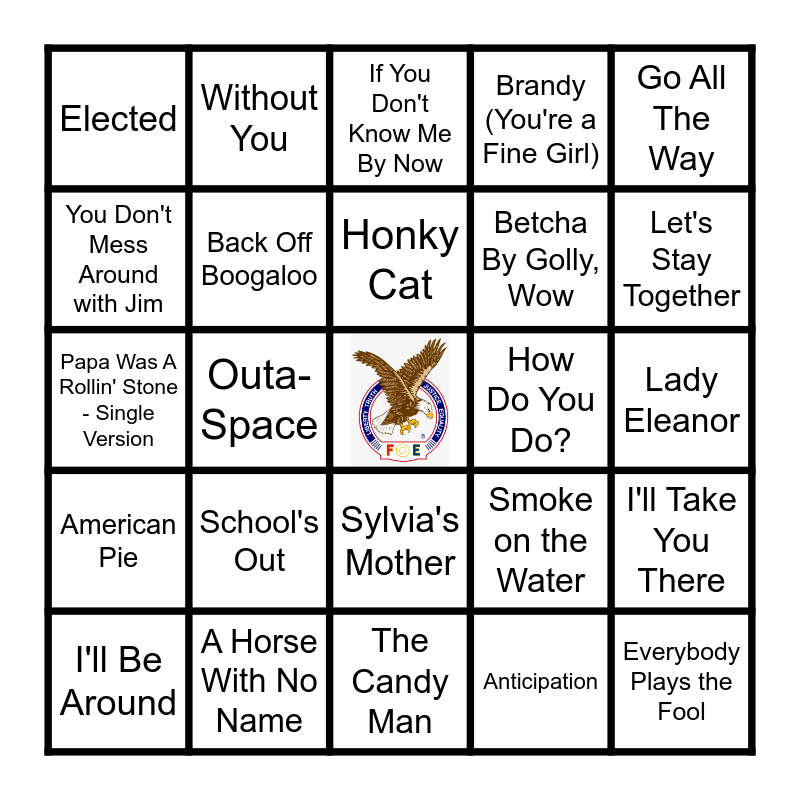 This bingo card has a free space and 58 words: (If Loving You Is Wrong) I Don't Want to Be Right, A Horse With No Name, Alone Again (Naturally), American Pie, Anticipation, Baby Don't Get Hooked on Me, Back Off Boogaloo, Ben - Single Version, Betcha By Golly, Wow, Brand New Key, Brandy (You're a Fine Girl), Daddy Don't You Walk So Fast, Diamonds Are Forever, Do It Again, Doctor My Eyes, Elected, Everybody Plays the Fool, Go All The Way, Heart of Gold, Honky Cat, How Do You Do?, If You Don't Know Me By Now, I'll Be Around, I'll Take You There, It Never Rains in Southern California, Lady Eleanor, Layla, Lean on Me, Let's Stay Together, Long Cool Woman (In a Black Dress), Looking Through The Eyes Of Love, Mama Weer All Crazee Now, Me and Julio Down by the Schoolyard, My Ding-A-Ling - Live At Lanchester Arts Festival,1972, Nice to Be with You, Nights In White Satin, Oh Girl, Outa-Space, Papa Was A Rollin' Stone - Single Version, Precious and Few, School's Out, Slippin' Into Darkness, Smoke on the Water, Song Sung Blue, Summer Breeze, Superstition - Single Version, Sweet Seasons, Sylvia's Mother, The Candy Man, The City of New Orleans, The Lion Sleeps Tonight, Tumbling Dice, Ventura Highway, Walk On the Wild Side, Without You, You Are The Sunshine Of My Life, You Don't Mess Around with Jim and You're So Vain.