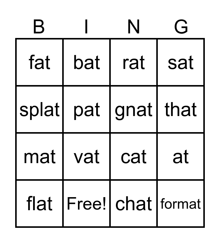 This bingo card has 16 words: Free!, at, rat, fat, mat, bat, cat, chat, splat, pat, flat, sat, vat, that, gnat and format.