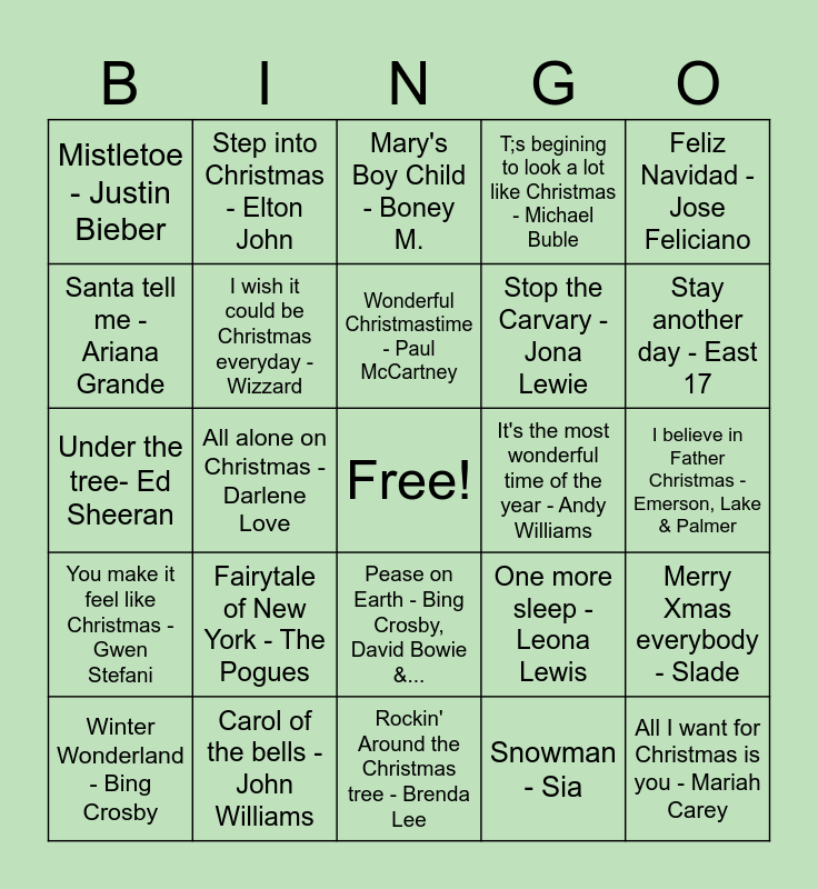 This bingo card has a free space and 51 words: Last Christmas - Wham!, All I want for Christmas is you - Mariah Carey, Merry Christmas Everyone - Shakin's Stevens, Rockin' Around the Christmas tree - Brenda Lee, Fairytale of New York - The Pogues, Underneath the tree - Kelly Clarkson, Step into Christmas - Elton John, Do they know it's Christmas? - Band Aid, Santa tell me - Ariana Grande, Driving home for Christmas - Chris Rea, I wish it could be Christmas everyday - Wizzard, T;s begining to look a lot like Christmas - Michael Buble, Merry Xmas everybody - Slade, One more sleep - Leona Lewis, Merry Christmas - Ed Sheeran & Elton John, Happy Xmas - John Lennon, Wonderful Christmastime - Paul McCartney, It's the most wonderful time of the year - Andy Williams, Jingle Bell Rock - Bobby Helms, Feliz Navidad - Jose Feliciano, All alone on Christmas - Darlene Love, Snowman - Sia, Mistletoe - Justin Bieber, Stop the Carvary - Jona Lewie, Holly Jolly Christmas - Michael Buble, Santa Claus is coming to town - Jackson 5, Stay another day - East 17, What Christmas means to me - Stevie Wonder, Winter Wonderland - Bing Crosby, Mary's Boy Child - Boney M., Run Rudolph run - Chuck Berry, Lonely this Christmas - Mud, Christmas lights - Coldplay, 2000 miles- Pretenders, Christmas time - The Darkness, Carol of the bells - John Williams, Let it snow! - Frank Sinatra, Have yourself a merry little Christmas - Frank Sinatra, Mistletoe & wine - Cliff Richard, White Christmas - Bing Crosby, I believe in Father Christmas - Emerson, Lake & Palmer, You make it feel like Christmas - Gwen Stefani, Thank God it's Christmas - Queen, Frosty the snowman - The Ronettes, Rudolph the Red-Noised reindeer - Dear Martin, The Power of Love - Frankie goes to Hollywood, Under the tree- Ed Sheeran, Blue Christmas - Elvis Presley, Please come home for Christmas - Eagles, Pease on Earth - Bing Crosby, David Bowie &... and You're Christmas to me - Sam Ryder.
