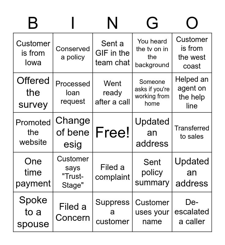 This bingo card has a free space and 24 words: Customer says "Trust-Stage", Filed a Concern, Went ready after a call, Spoke to a spouse, Customer is from the west coast, Customer is from Iowa, Offered the survey, Conserved a policy, Updated an address, Filed a complaint, Someone asks if you're working from home, Promoted the website, Sent policy summary, Updated an address, Processed loan request, Customer uses your name, Transferred to sales, Sent a GIF in the team chat, Helped an agent on the help line, Change of bene esig, De-escalated a caller, One time payment, You heard the tv on in the background and Suppress a customer.
