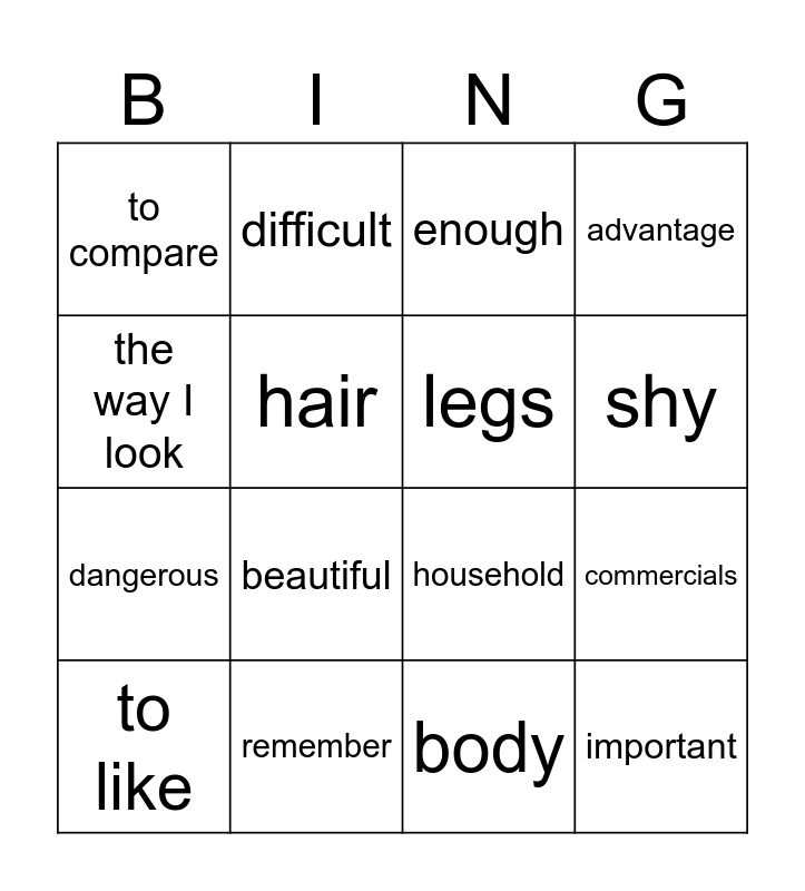 This bingo card has 20 words: commercials, variety, enough, future, to like, the way I look, remember, to compare, dangerous, difficult, beautiful, household, hair, important, legs, head, shy, advantage, body and doll.