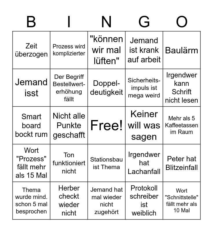 This bingo card has a free space and 24 words: Ton funktioniert nicht, Herber checkt wieder nicht, Doppel- deutigkeit, Thema wurde mind. schon 5 mal besprochen, Baulärm, Zeit überzogen, Jemand isst, Prozess wird komplizierter, Keiner will was sagen, Stationsbau ist Thema, Sicherheits-impuls ist mega weird, Smart board bockt rum, Irgendwer hat Lachanfall, Peter hat Blitzeinfall, Der Begriff Bestellwert- erhöhung fällt, Protokoll schreiber ist weiblich, Mehr als 5 Kaffeetassen im Raum, "können wir mal lüften", Irgendwer kann Schrift nicht lesen, Nicht alle Punkte geschafft, Wort "Schnittstelle" fällt mehr als 10 Mal, Wort "Prozess" fällt mehr als 15 Mal, Jemand ist krank auf arbeit and Jemand hat mal wieder nicht zugehört.