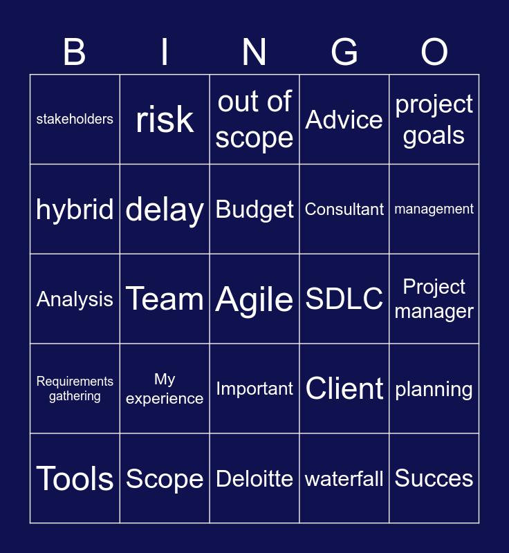This bingo card has 25 words: Requirements gathering, Scope, Agile, waterfall, project goals, stakeholders, risk, out of scope, SDLC, planning, hybrid, delay, Deloitte, Client, management, Tools, Team, Budget, Consultant, Project manager, Analysis, My experience, Important, Advice and Succes.