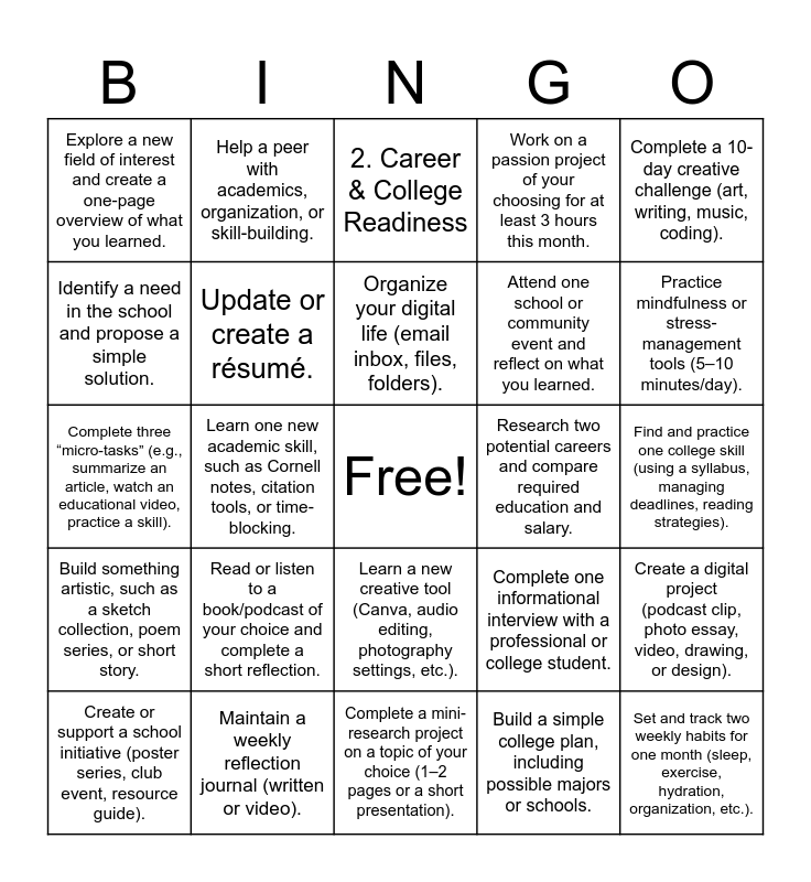 This bingo card has a free space and 31 words: Complete a mini-research project on a topic of your choice (1–2 pages or a short presentation)., Read one nonfiction article or chapter per week and submit a 1–2 sentence reflection., Learn one new academic skill, such as Cornell notes, citation tools, or time-blocking., Complete an online micro-credential (Google, Everfi, Khan Academy module, etc.)., Explore a new field of interest and create a one-page overview of what you learned., 2. Career & College Readiness, Update or create a résumé., Complete one informational interview with a professional or college student., Research two potential careers and compare required education and salary., Build a simple college plan, including possible majors or schools., Find and practice one college skill (using a syllabus, managing deadlines, reading strategies)., Set and track two weekly habits for one month (sleep, exercise, hydration, organization, etc.)., Create a personal budget or savings plan., Cook or learn two new recipes and reflect on the experience., Practice mindfulness or stress-management tools (5–10 minutes/day)., Complete a two-week time audit to understand how you use your free time., Create a digital project (podcast clip, photo essay, video, drawing, or design)., Read or listen to a book/podcast of your choice and complete a short reflection., Build something artistic, such as a sketch collection, poem series, or short story., Learn a new creative tool (Canva, audio editing, photography settings, etc.)., Complete a 10-day creative challenge (art, writing, music, coding)., Volunteer for at least 2 hours in any area of interest., Create or support a school initiative (poster series, club event, resource guide)., Help a peer with academics, organization, or skill-building., Attend one school or community event and reflect on what you learned., Identify a need in the school and propose a simple solution., Work on a passion project of your choosing for at least 3 hours this month., Complete three “micro-tasks” (e.g., summarize an article, watch an educational video, practice a skill)., Maintain a weekly reflection journal (written or video)., Organize your digital life (email inbox, files, folders). and Create a monthly “highlight reel” summarizing your accomplishments or learning..