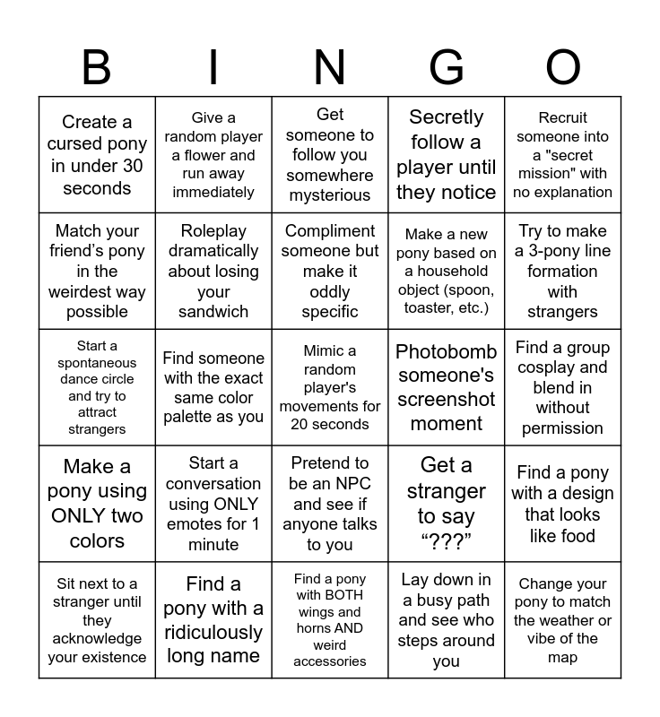 This bingo card has a free space and 24 words: Start a conversation using ONLY emotes for 1 minute, Find a pony with a ridiculously long name, Compliment someone but make it oddly specific, Sit next to a stranger until they acknowledge your existence, Recruit someone into a "secret mission" with no explanation, Create a cursed pony in under 30 seconds, Match your friend’s pony in the weirdest way possible, Give a random player a flower and run away immediately, Photobomb someone's screenshot moment, Pretend to be an NPC and see if anyone talks to you, Make a new pony based on a household object (spoon, toaster, etc.), Start a spontaneous dance circle and try to attract strangers, Get a stranger to say “???”, Find a pony with a design that looks like food, Roleplay dramatically about losing your sandwich, Lay down in a busy path and see who steps around you, Find a group cosplay and blend in without permission, Get someone to follow you somewhere mysterious, Try to make a 3-pony line formation with strangers, Find someone with the exact same color palette as you, Change your pony to match the weather or vibe of the map, Make a pony using ONLY two colors, Secretly follow a player until they notice and Find a pony with BOTH wings and horns AND weird accessories.