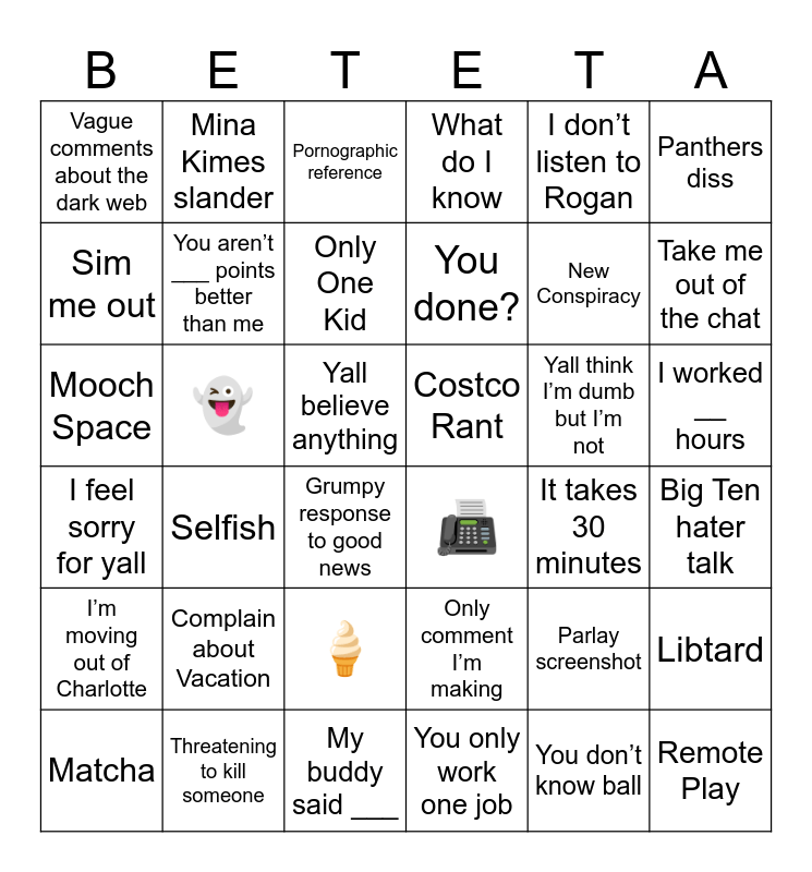 This bingo card has 36 words: Only comment I’m making, 🍦, You only work one job, Sim me out, I feel sorry for yall, Costco Rant, You aren’t ___ points better than me, My buddy said ___, I don’t listen to Rogan, Parlay screenshot, Take me out of the chat, What do I know, Libtard, 👻, You done?, Vague comments about the dark web, I’m moving out of Charlotte, Yall think I’m dumb but I’m not, Mooch Space, Pornographic reference, Yall believe anything, Selfish, 📠, Grumpy response to good news, It takes 30 minutes, Mina Kimes slander, New Conspiracy, Threatening to kill someone, Only One Kid, Panthers diss, Remote Play, Matcha, Big Ten hater talk, I worked __ hours, Complain about Vacation and You don’t know ball.