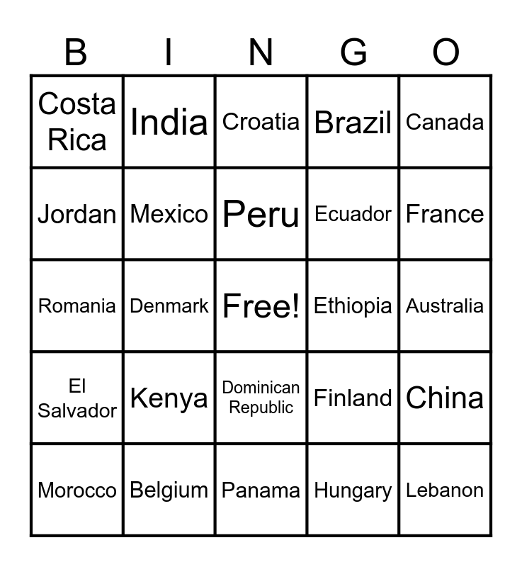 This bingo card has a free space and 70 words: Argentina, Australia, Austria, Bangladesh, Belgium, Bolivia, Brazil, Bulgaria, Canada, Chile, China, Colombia, Costa Rica, Croatia, Czech Republic, Denmark, Dominican Republic, Ecuador, Egypt, El Salvador, Ethiopia, Finland, France, Germany, Ghana, Greece, Guatemala, Honduras, Hungary, Iceland, India, Indonesia, Iran, Iraq, Ireland, Israel, Italy, Jamaica, Japan, Jordan, Kazakhstan, Kenya, Lebanon, Libya, Malaysia, Mexico, Morocco, Nepal, Netherlands, New Zealand, Nicaragua, Nigeria, Norway, Pakistan, Panama, Paraguay, Peru, Philippines, Poland, Portugal, Romania, Russia, Saudi Arabia, South Africa, South Korea, Spain, Sweden, Switzerland, Thailand and Turkey.