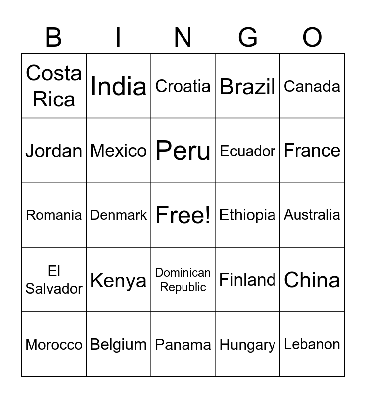 This bingo card has a free space and 70 words: Argentina, Australia, Austria, Bangladesh, Belgium, Bolivia, Brazil, Bulgaria, Canada, Chile, China, Colombia, Costa Rica, Croatia, Czech Republic, Denmark, Dominican Republic, Ecuador, Egypt, El Salvador, Ethiopia, Finland, France, Germany, Ghana, Greece, Guatemala, Honduras, Hungary, Iceland, India, Indonesia, Iran, Iraq, Ireland, Israel, Italy, Jamaica, Japan, Jordan, Kazakhstan, Kenya, Lebanon, Libya, Malaysia, Mexico, Morocco, Nepal, Netherlands, New Zealand, Nicaragua, Nigeria, Norway, Pakistan, Panama, Paraguay, Peru, Philippines, Poland, Portugal, Romania, Russia, Saudi Arabia, South Africa, South Korea, Spain, Sweden, Switzerland, Thailand and Turkey.